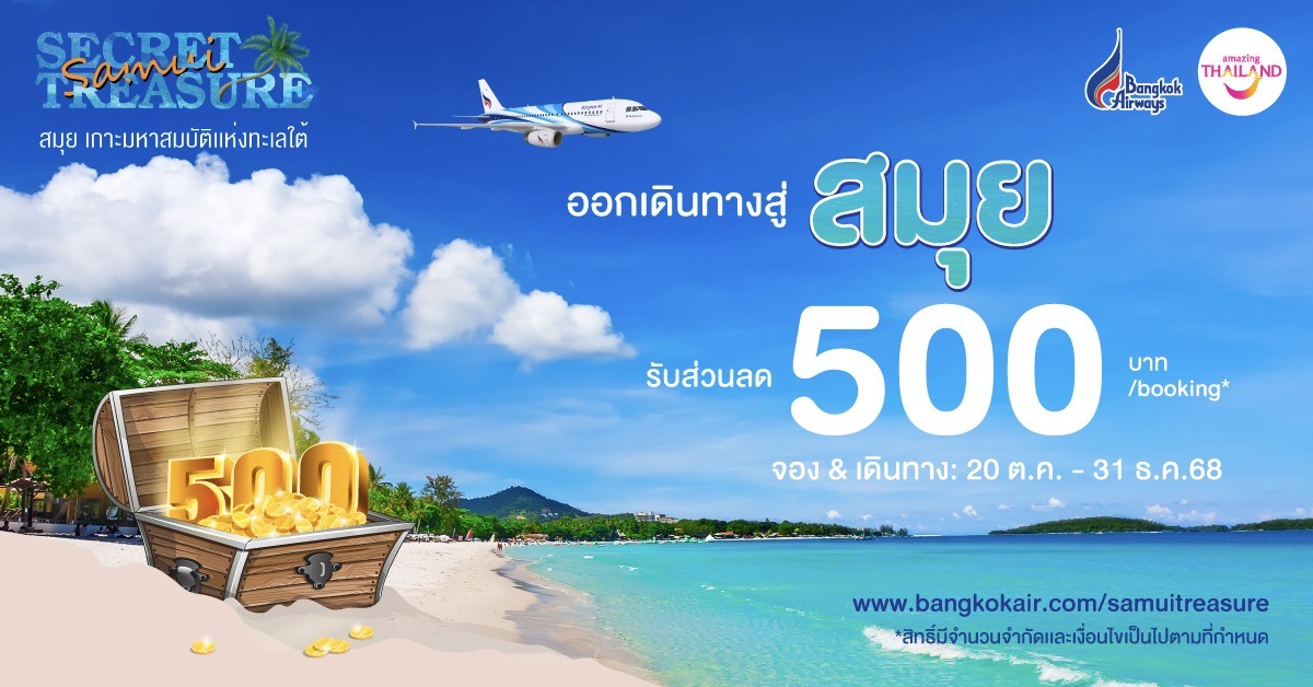 From Oct. 20 to Dec. 31, 2025, passengers can enjoy a B500 discount per booking on both one-way and round-trip domestic flights to Koh Samui, available exclusively through bangkokair.com/samuitreasure. The offer applies to routes departing from Suvarnabhumi, Don Mueang, Chiang Mai, Phuket, Krabi, and U-Tapao, with only 400 total redemptions available throughout the campaign period.