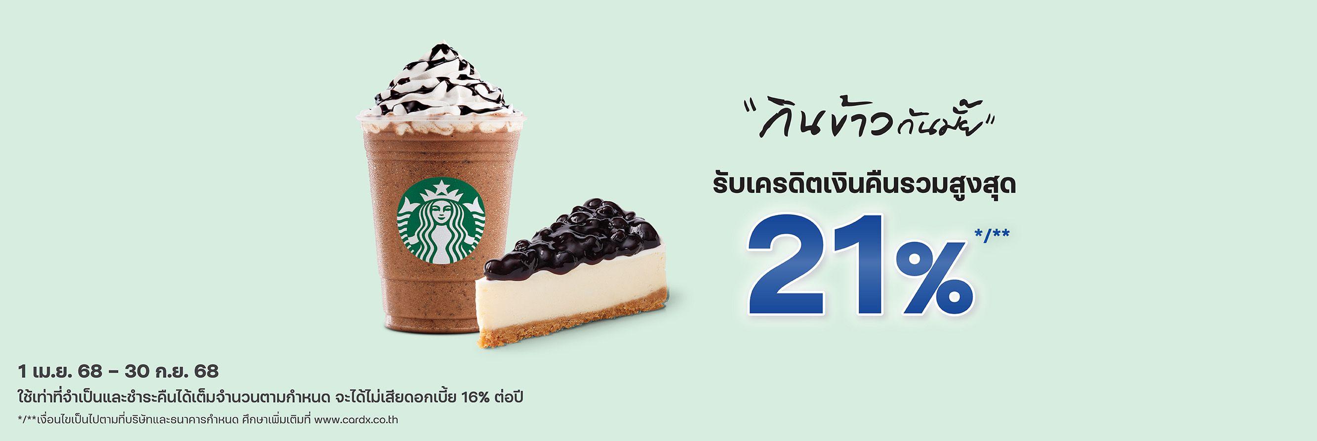 Get more from your Starbucks visits with an exclusive credit card promotion from CardX and SCB. From April 4 to Sept. 30, 2025, CardX and SCB credit cardholders can earn up to 21% cash back when making purchases at any Starbucks location in Thailand or through the Starbucks Mobile Application.