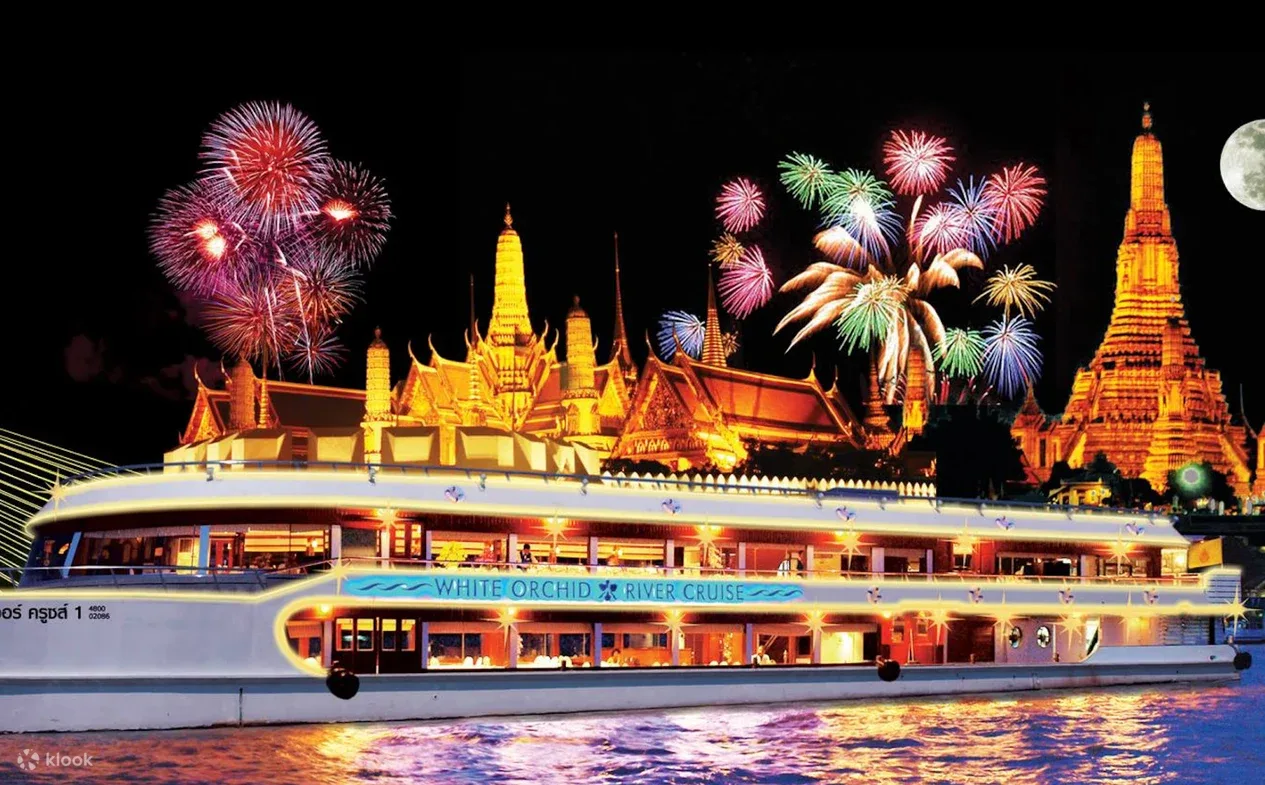 Enjoy a magical evening on the Chao Phraya White Orchid Cruise, a luxurious river journey that showcases the beauty of Bangkok at night. Departing from ICONSIAM Pier 4 or Asiatique The Riverfront Pier, this two-hour cruise features a buffet dinner with Thai and international favorites, a welcome drink, and live entertainment to set the mood.