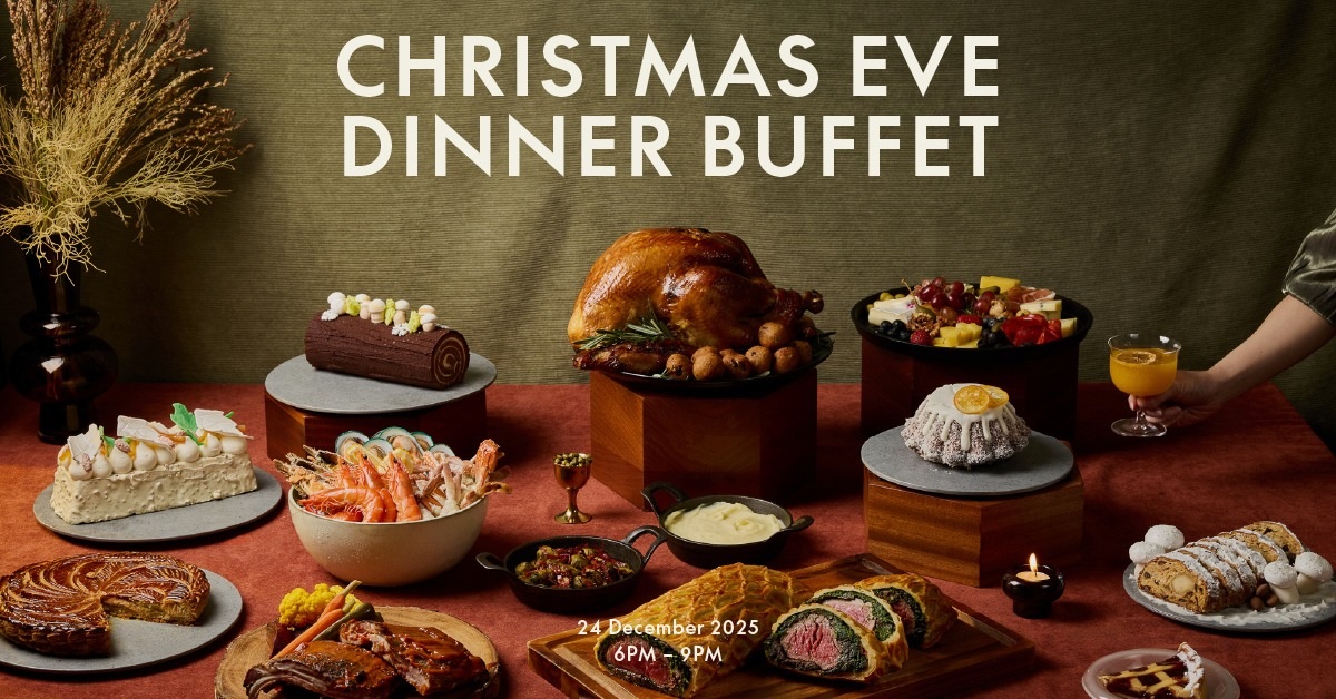 Guests can savor classic holiday mains such as slow-roasted turkey, BBQ pork ribs, meatloaf Wellington, and festive porchetta, alongside fresh seafood offerings like grilled prawns, local catch of the day, and seafood on ice, including blue crab and rock lobster. Additional highlights include sushi, sashimi, pasta stations, pizza, salads, and cheese and charcuterie selections. Finish the evening on a sweet note with decadent desserts, including Valrhona chocolate yule log, Italian torte, and English fruit cake.