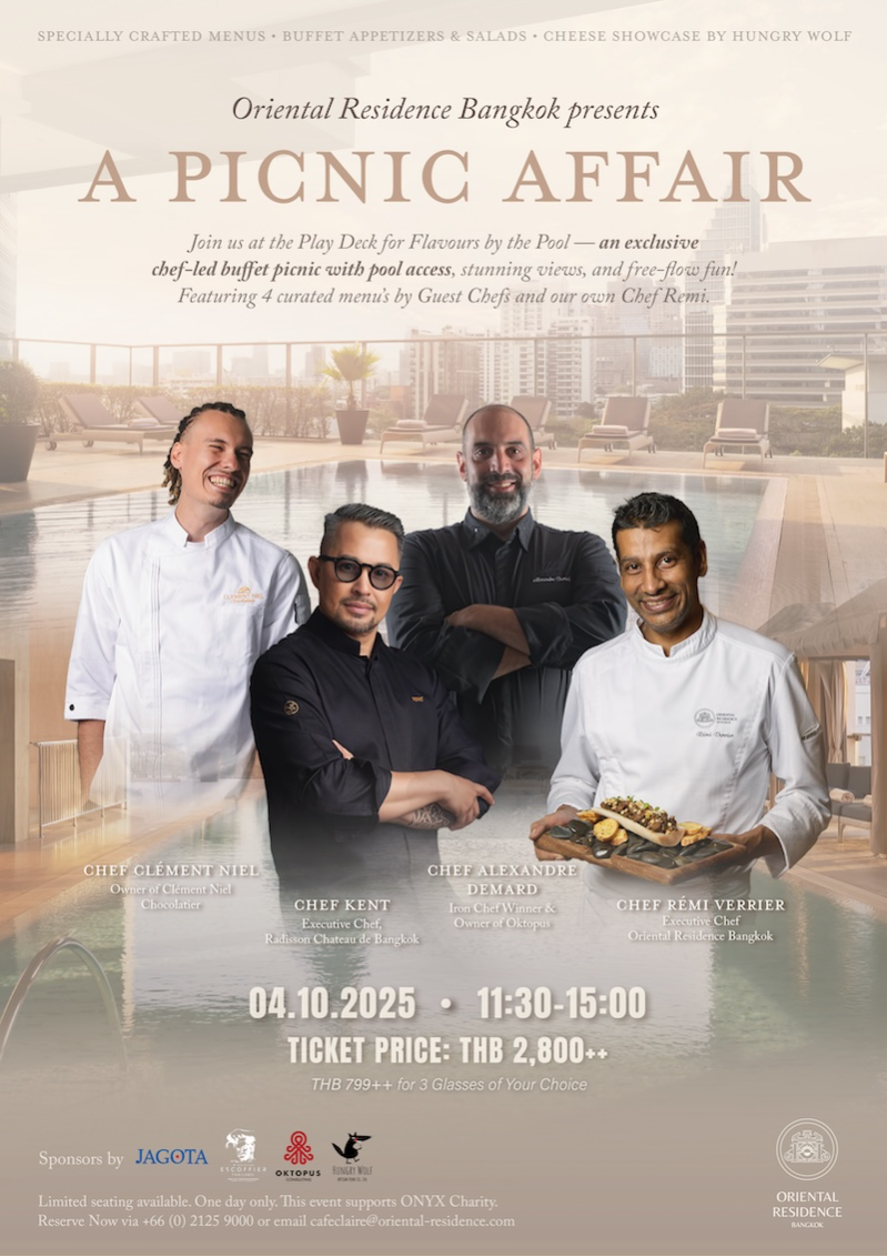 Gather your family and friends for a delightful afternoon by the pool at A Picnic Affair, happening on Saturday, Oct. 4, 2025, from 12 PM to 2:30 PM at the Play Deck, 4th floor of Oriental Residence Bangkok.