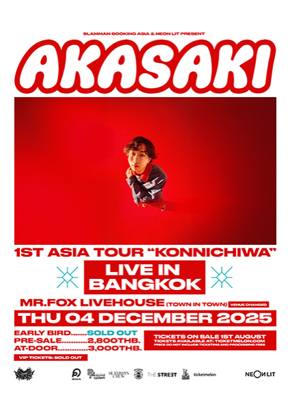 The venue will follow a clear queueing system, with early purchasers admitted first and VIP entry handled by number order. This one-night-only show offers a rare chance to witness AKASAKI’s first-ever performance in Bangkok as he continues building momentum across Asia.
