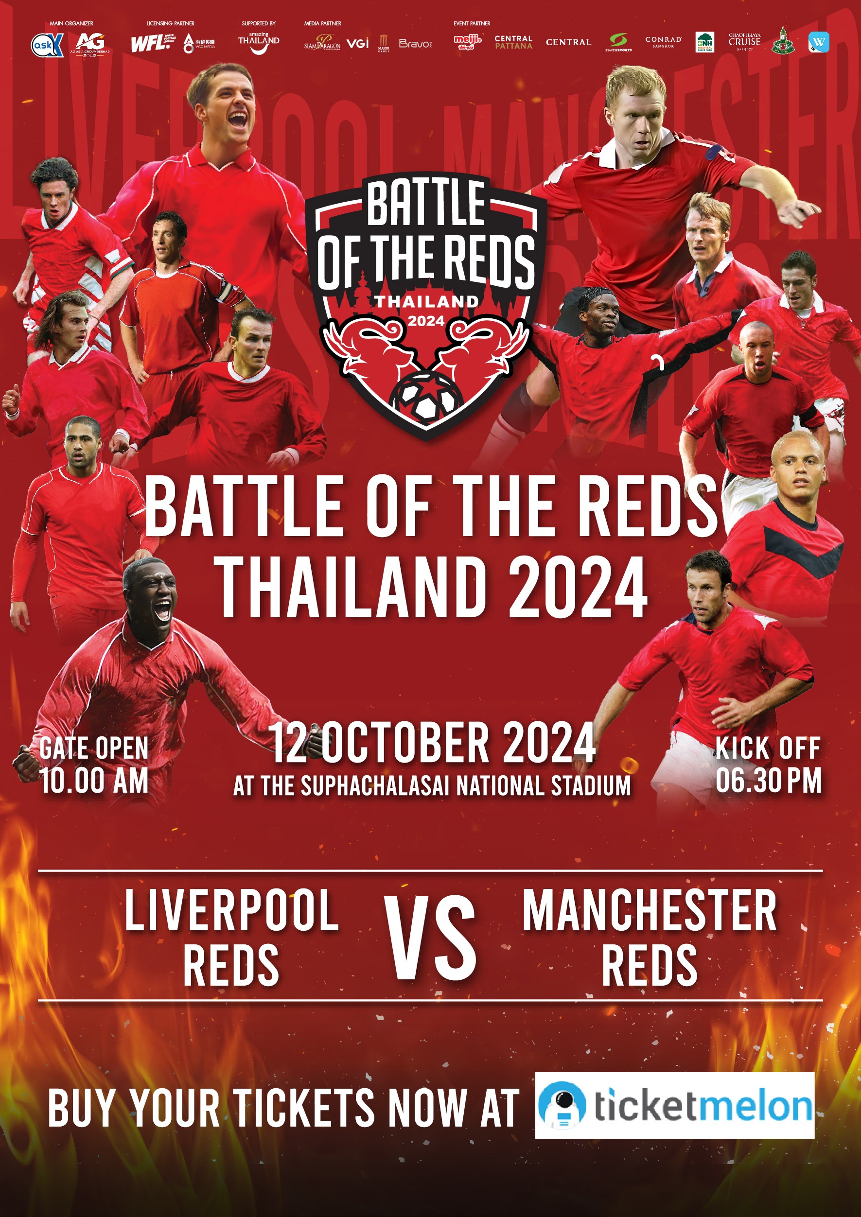 The highly anticipated Battle of the Reds Thailand 2024 is coming to Supachalasai National Stadium on Oct. 12, 2024! Football legends from the iconic Liverpool Reds and Manchester Reds will clash in an unforgettable match that promises to thrill fans from both sides. This year's star-studded lineup includes legends such as Michael Owen, Robbie Fowler, Mikael Silvestre, and Paul Scholes.
