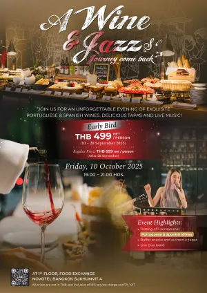 Raise a glass to an elegant night of fine wine and music at the Wine Testing Event, slated for Oct. 10 at Food Exchange, Novotel Bangkok Sukhumvit 4. This special evening promises a refined blend of culture and indulgence where guests can savor Spanish and Portuguese wines, delicious tapas, and the smooth sounds of live jazz. Tickets are priced at THB699 per person, with an early bird offer of THB499 available for a limited time. Entry is for guests 20 years and above only.