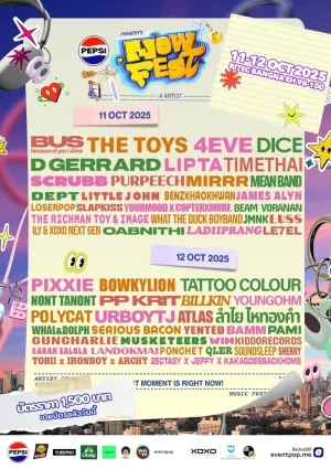 Join fellow music lovers at PEPSI presents NOW FEST 2025, a two-day festival taking place on Oct. 11-12 at BITEC Bangna. Day one features standout performances by BUS (because of you i shine), The TOYS, 4EVE, Lipta, D Gerrard, Scrubb, MIRRR, Mean Band, Dept, and more. On day two, fans can see acts like Pixxie, Nont Tanont, Bowkylion, Tattoo Colour, Billkin, Youngohm, Polycat, UrboyTJ, Serious Bacon, Musketeers, and other crowd favorites. Get your tickets now!