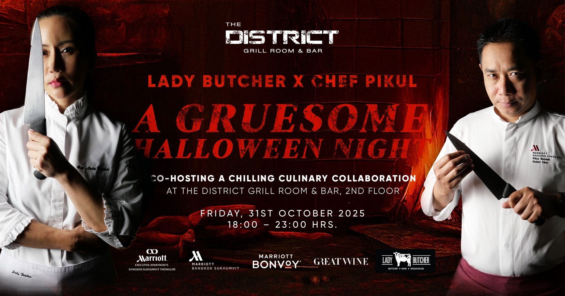 This Halloween, The District Grill Room & Bar at Bangkok Marriott Hotel Sukhumvit invites gourmands and thrill-seekers to A Gruesome Halloween Night, a chillingly creative culinary event featuring Chef Lady Butcher and Chef PiKul.