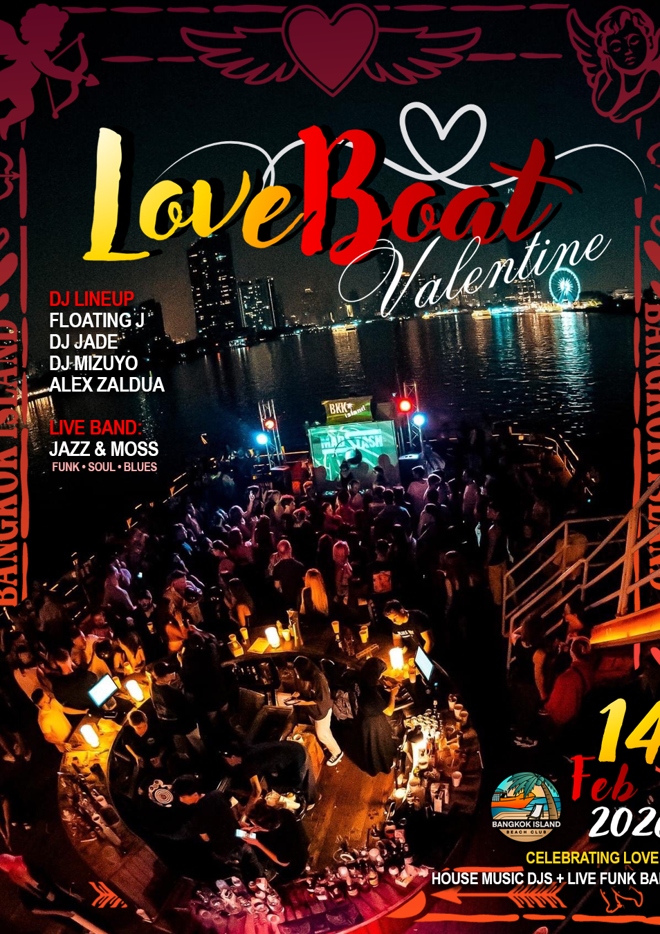 “Love Boat Valentine” is a Valentine’s Day cruise event departing from Bangkok Island Pier (Rama 3) on Friday, Feb. 14, 2026, at 6 p.m. The route extends toward the Charoen Krung district, allowing for a longer and more scenic journey timed with expected fireworks between 8:30–9 p.m.