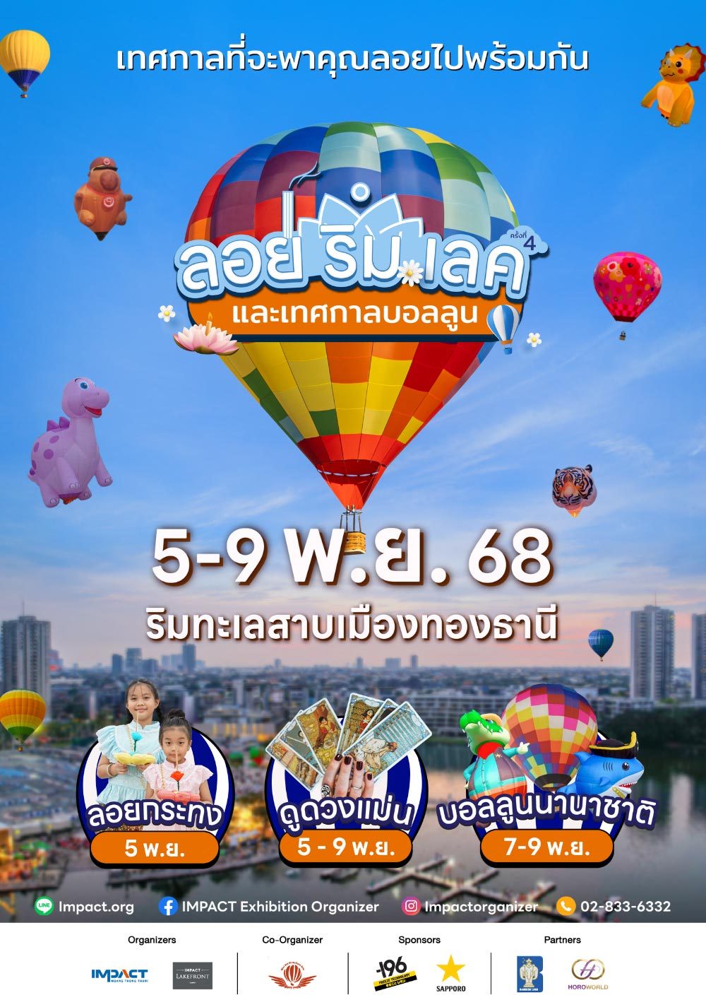 Experience Loy Rim Lake with Balloons 2025, a five-day festival blending Thai tradition with international balloon artistry, happening Nov. 5–9, 2025, from 4 PM to 11 PM at IMPACT Lakefront 1. Visitors can float eco-friendly Krathongs on the scenic lake, enjoy fortune-telling sessions with Horoworld, and watch the mesmerizing Balloon Night Glow light and sound show.