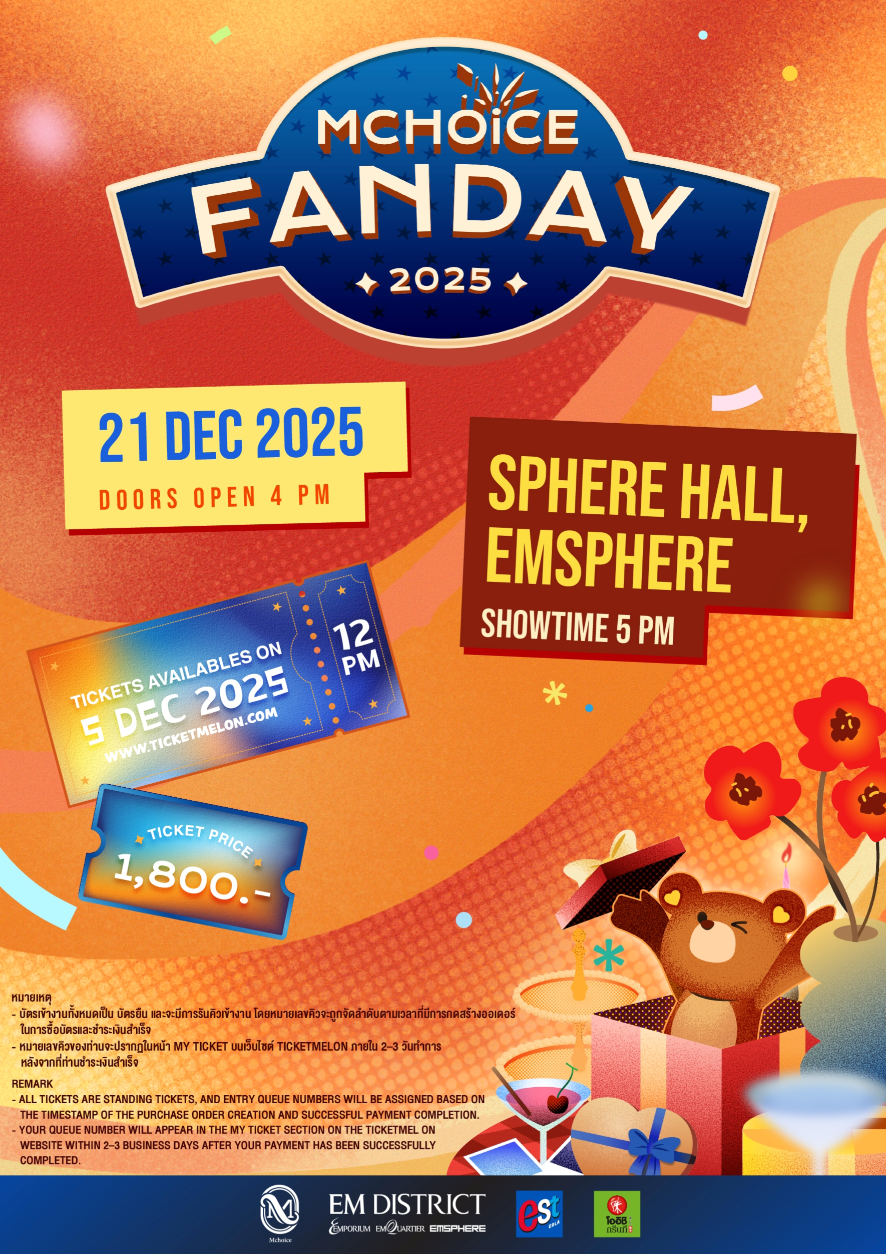All tickets are standing at THB 1,800, available from Friday, Dec. 5, 2025, at 12:00 PM via Ticketmelon. Winners of the group photo sessions will be announced on Dec. 15 at 6:00 PM through MChoice’s social media. Celebrate your love for MChoice in this one-of-a-kind fan event designed for unforgettable memories.
