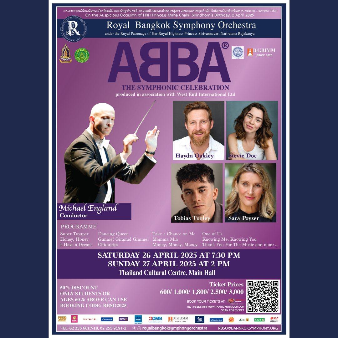 Join the Royal Bangkok Symphony Orchestra for “ABBA: The Symphonic Celebration” on April 26, 2025, at the Thailand Cultural Centre. Conducted by Michael England, this concert will feature stunning renditions of ABBA’s greatest hits, including “Super Trouper,” “Dancing Queen,” “Take A Chance on Me,” and more. West End vocalists Stevie Doc, Sara Poyzer, Tobias Turley, and Haydn Oakley will perform these iconic songs with the full force of an orchestra, bringing a fresh and exciting energy to ABBA’s classic hits.