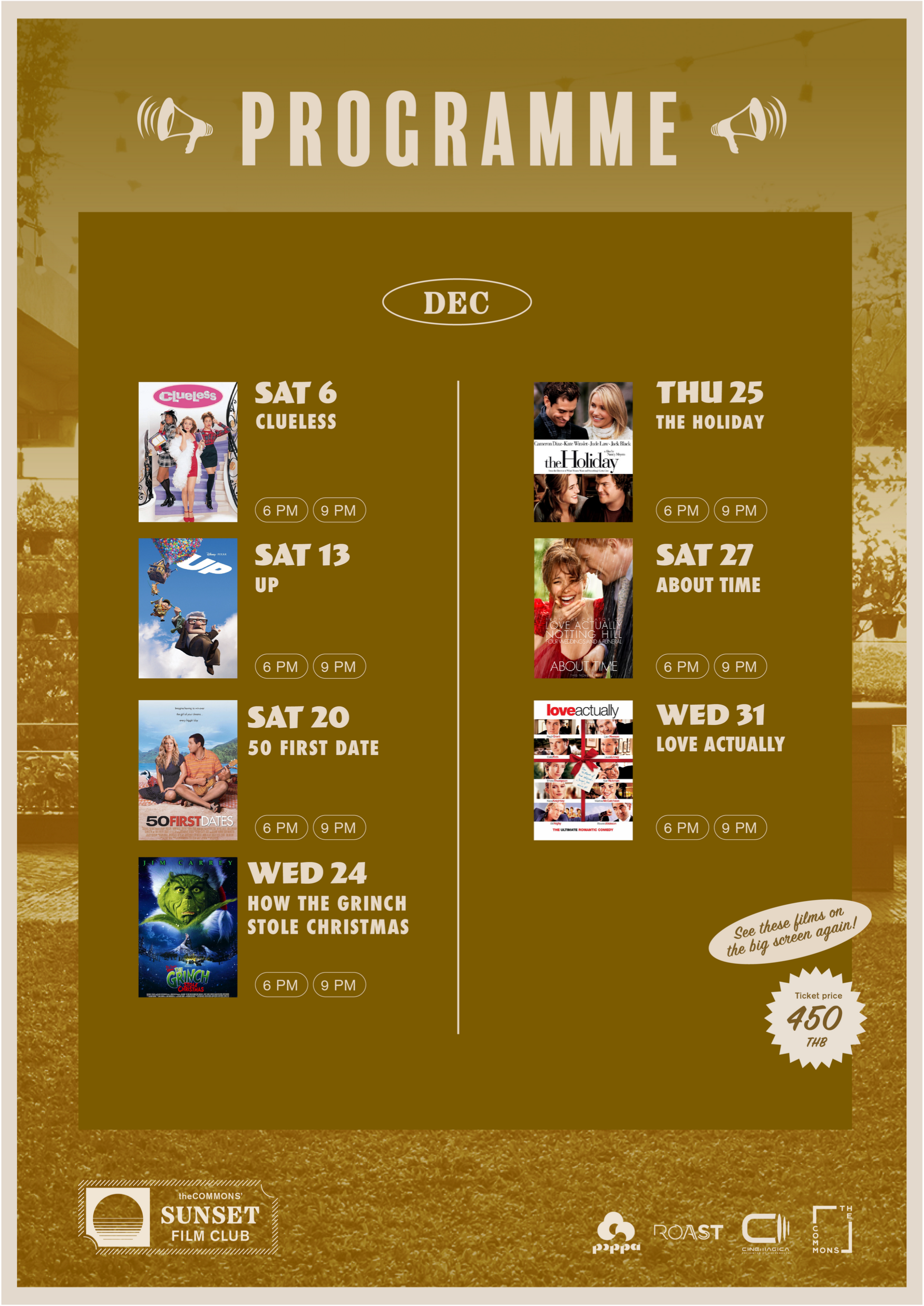 The beloved Sunset Film Club returns to theCOMMONS Thonglor for a limited run from Dec. 6 to 31, 2025, transforming the Top Yard into an open-air cinema filled with festive charm. This special edition invites movie lovers to unwind under the evening sky with a curated lineup that ranges from family favorites to classic holiday films. Expect screenings of titles like "Clueless," "Up," "50 First Dates," "How the Grinch Stole Christmas," "The Holiday," "About Time," and "Love Actually," all shown in English with Thai subtitles.