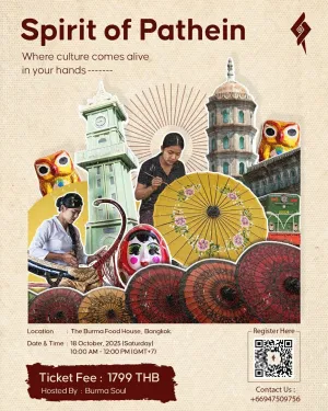Learn more about Myanmar’s heritage at the Spirit of Pathein Cultural Workshop on Oct. 18 at The Burma Food House, Bangkok. Hosted by Burma Soul, the event lets guests paint traditional Pathein umbrellas, enjoy a Burmese lunch and tea, and listen to live harp music. Each participant also receives a custom tote bag and a chance to win surprise gifts in the lucky draw. Limited slots are available, with early bird and group discounts offered.