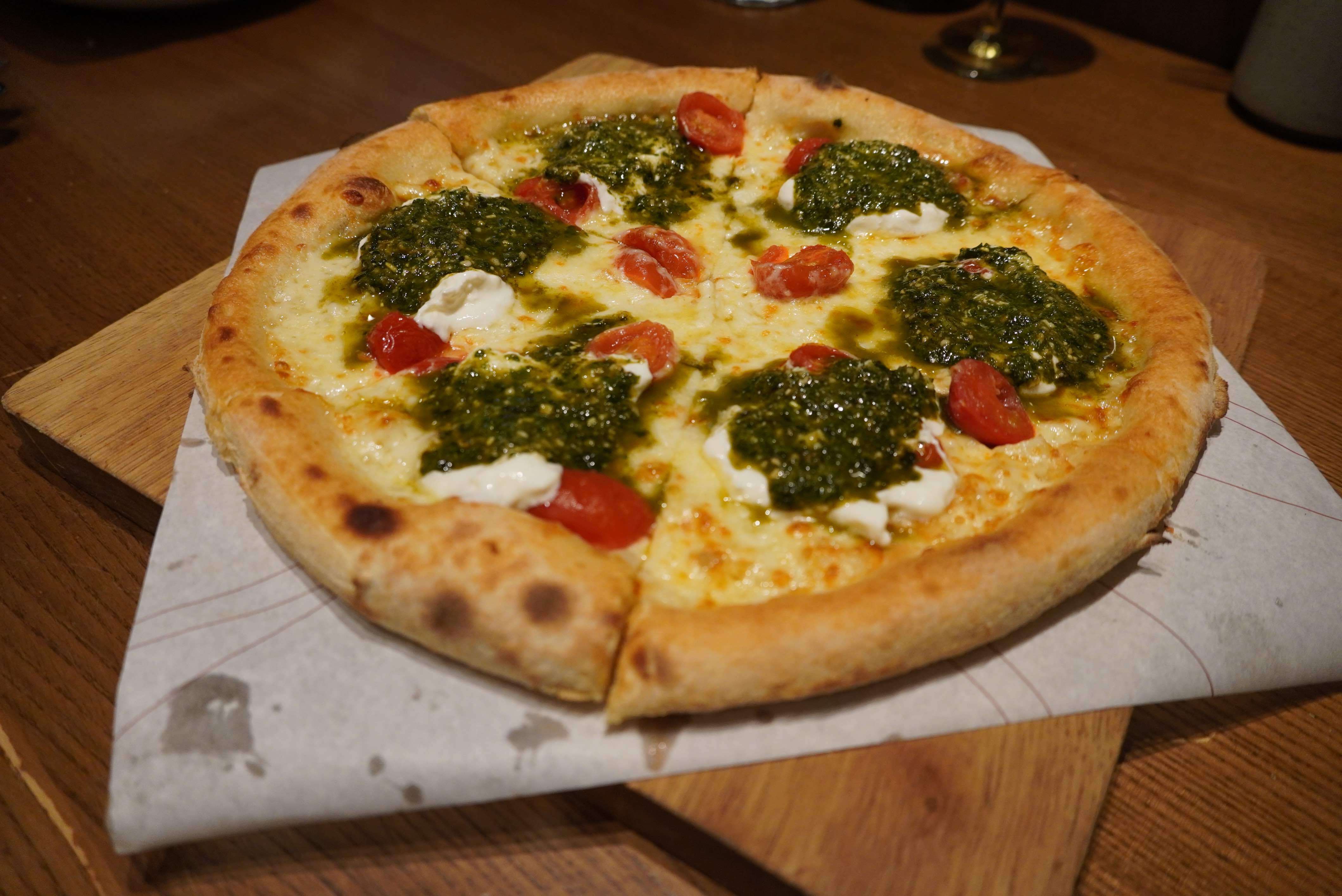 Glistening under the soft orange light within the diner, the delicate reds, whites, and green colours shimmer below. The power of the dish is in the pesto, a garlicky, fruity, and basil paste that covers your mouth, giving off a nutty aftertaste that could convince any diner to book a one-way ticket to Rome tomorrow. It is an oily pizza, so be prepared to eat with a fork and knife.