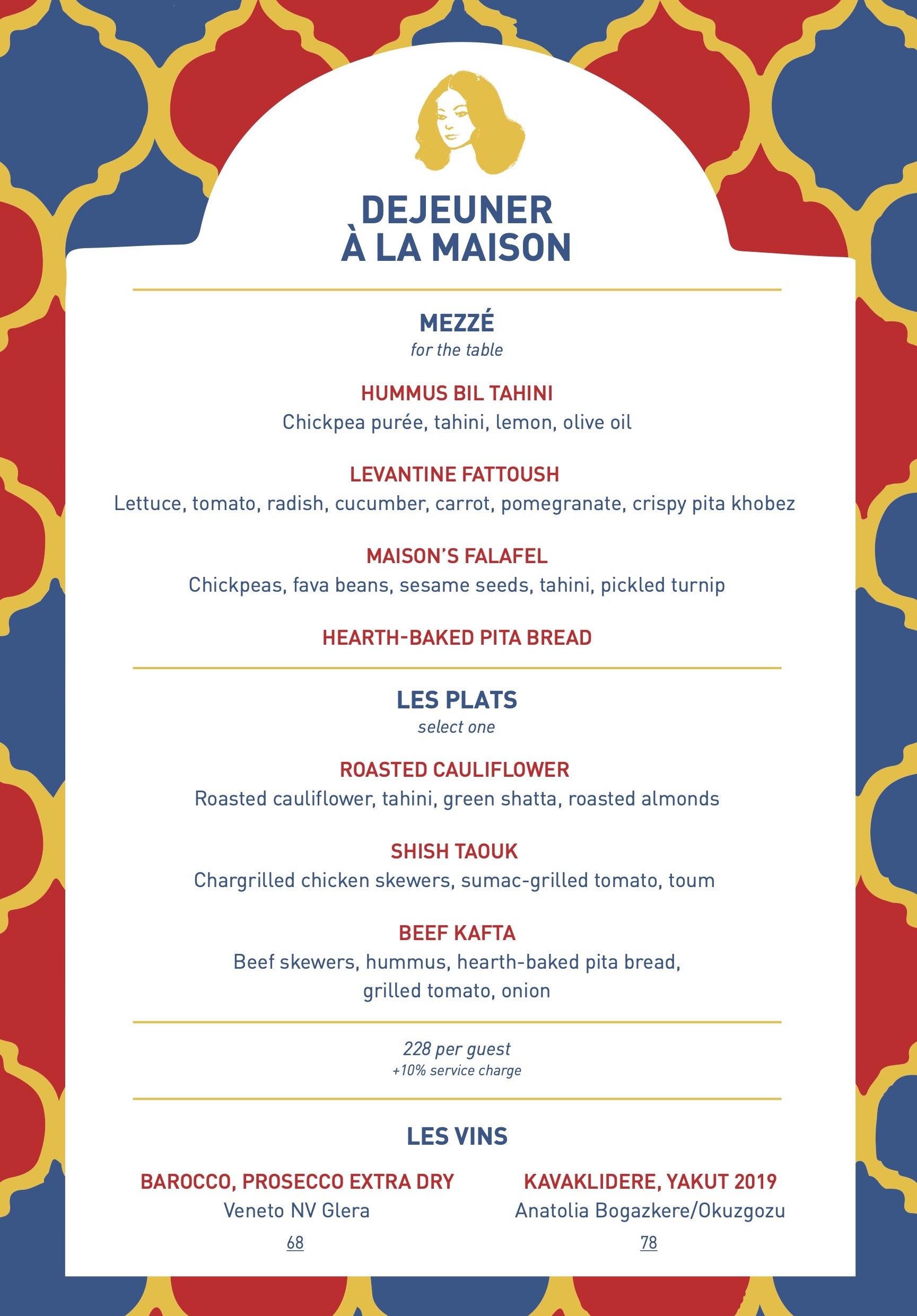 Step into the nostalgic elegance of 1960's Beirut at Maison Libanaise with our $228 2-course set lunch menu. Begin with shared starters like the classic Hummus bil tahini, vibrant Levantine fattoush, signature maison's falafel, and hearth-baked pita bread. Choose from main courses such as roasted cauliflower, shishtaouk, or beef kakta to complete your meal.