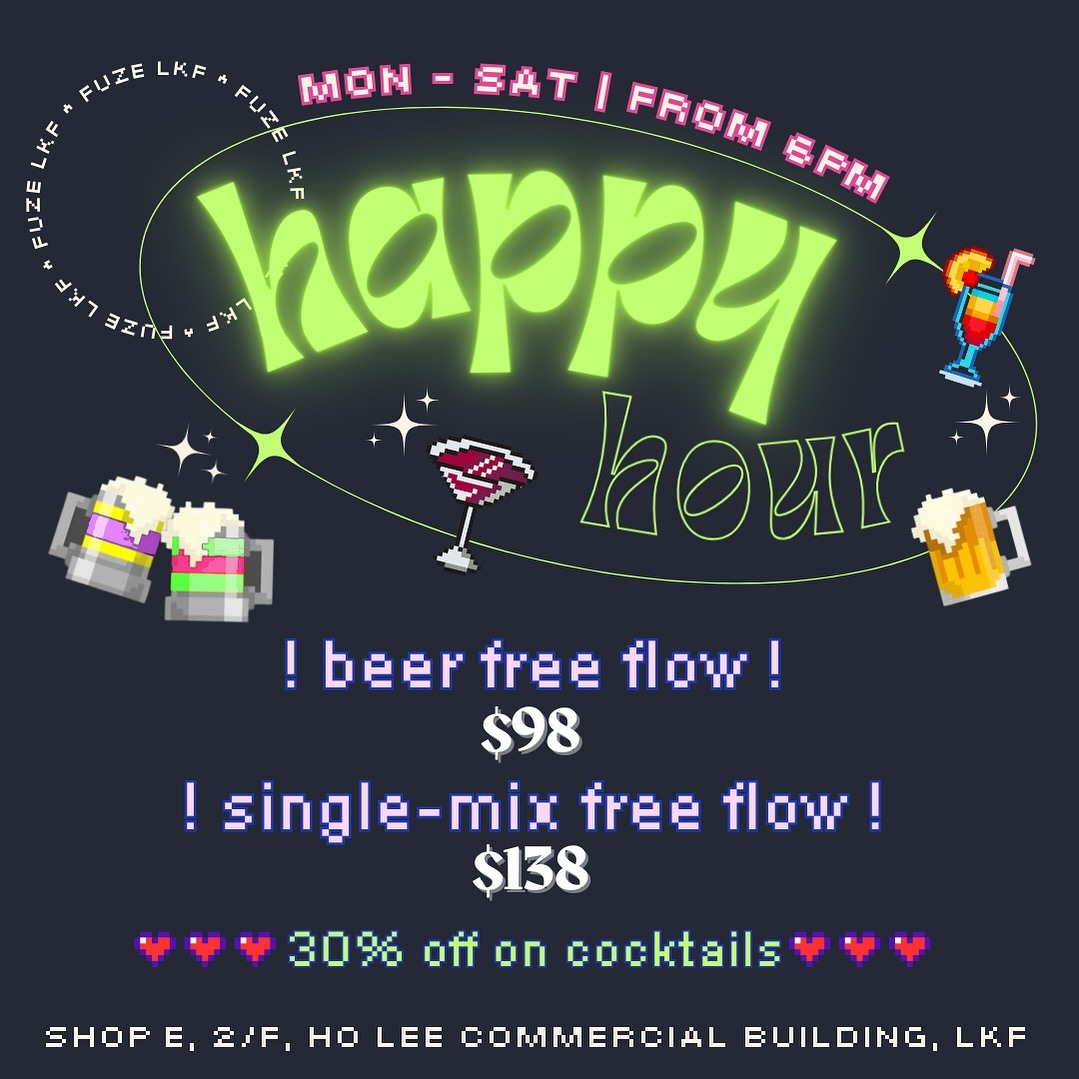 Nestled in the vibrant heart of Lan Kwai Fong, FUZE presents an irresistible offer for nightlife enthusiasts and casual drinkers alike. From Monday to Saturday, starting at 6 PM, this dynamic venue invites you to immerse yourself in an evening of endless libations and spirited camaraderie. Dive into the beer free-flow packages, starting at a wallet-friendly HK$98, perfect for those who appreciate the golden hues and refreshing taste of a well-crafted brew. For a more tailored experience, the single-mix free-flow packages, beginning at HK$138, offer a personalized twist to your night out. And for the cocktail aficionados, FUZE delights with a generous 30% discount on their cocktail menu, featuring an array of inventive concoctions that promise to tantalize your taste buds. Whether you're looking to kick back after a long day or gear up for a night on the town, FUZE in Lan Kwai Fong is your go-to destination for unbeatable deals and an unforgettable atmosphere.