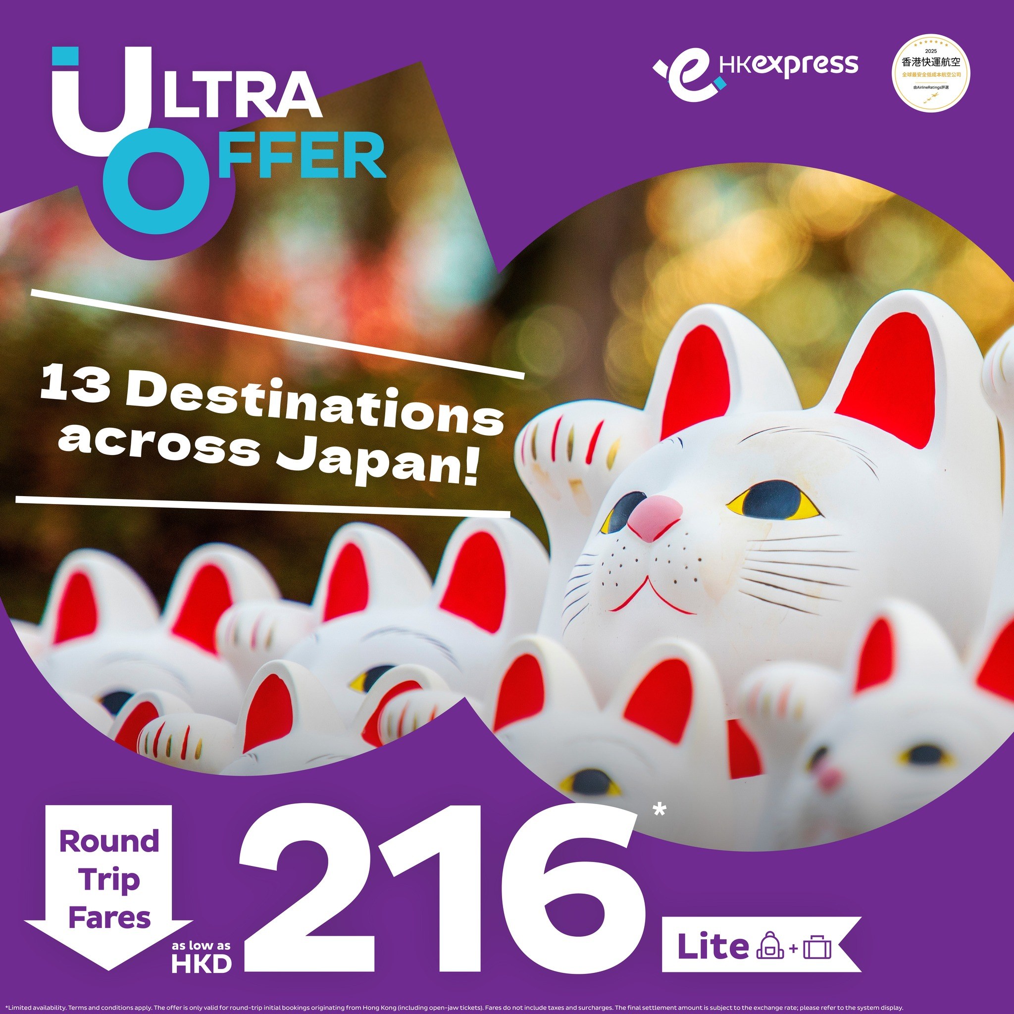 Unlock unbeatable travel deals with the return of the Ultra Offer, giving travelers access to round-trip Lite fares starting from just HK$216 across all 13 Japan routes! Book now and plan a getaway filled with everything from bustling city lights to serene countryside escapes. Whether you're chasing summer fireworks, indulging in epic shopping sprees, or capturing the beauty of autumn foliage, this offer brings Japan closer than ever — at an ultra-affordable price.