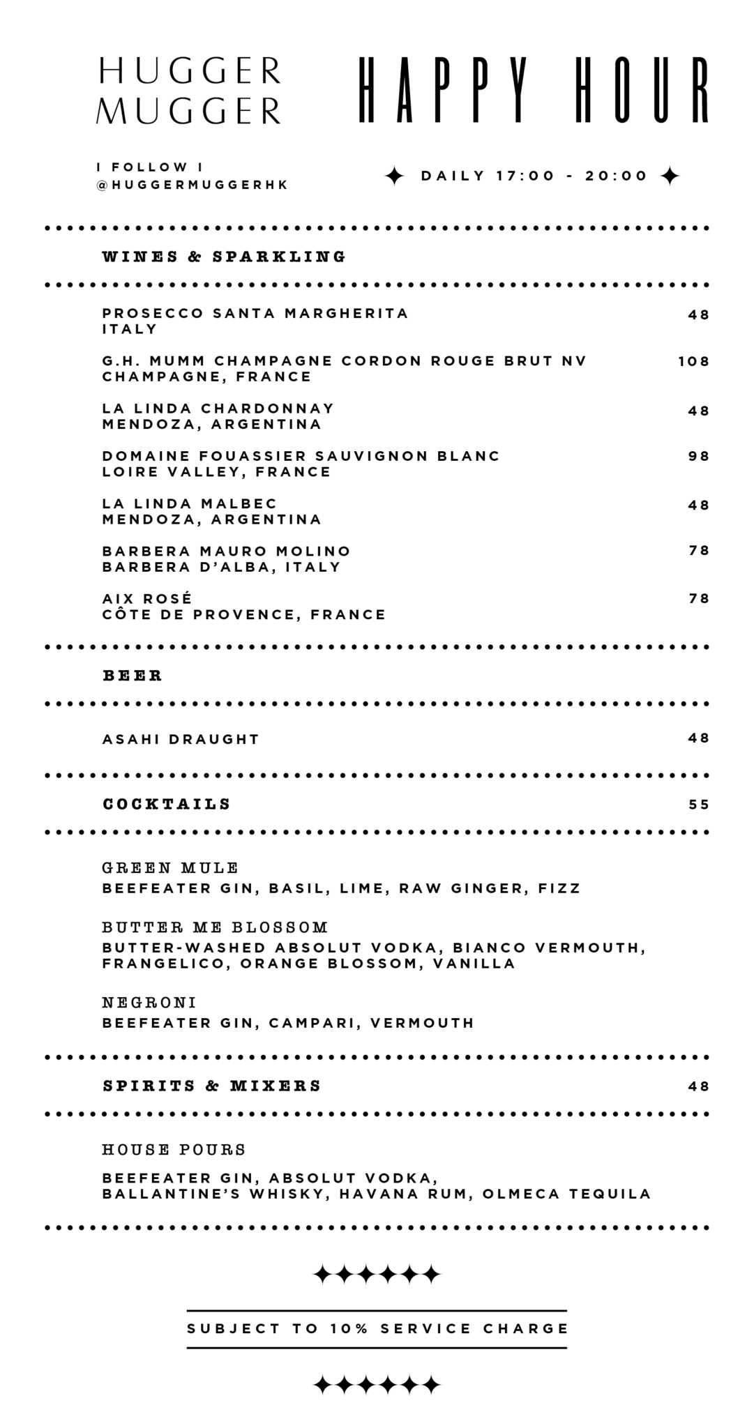 Step into the world of Hugger Mugger, a hidden gem with a British flair, located in the heart of Central, Hong Kong. Our Happy Hour is not just another deal; it's an experience that redefines the Central/Soho bar scene. Available every day from 5 PM to 8 PM, we offer an array of beverages starting at the unbeatable price of HKD 48.