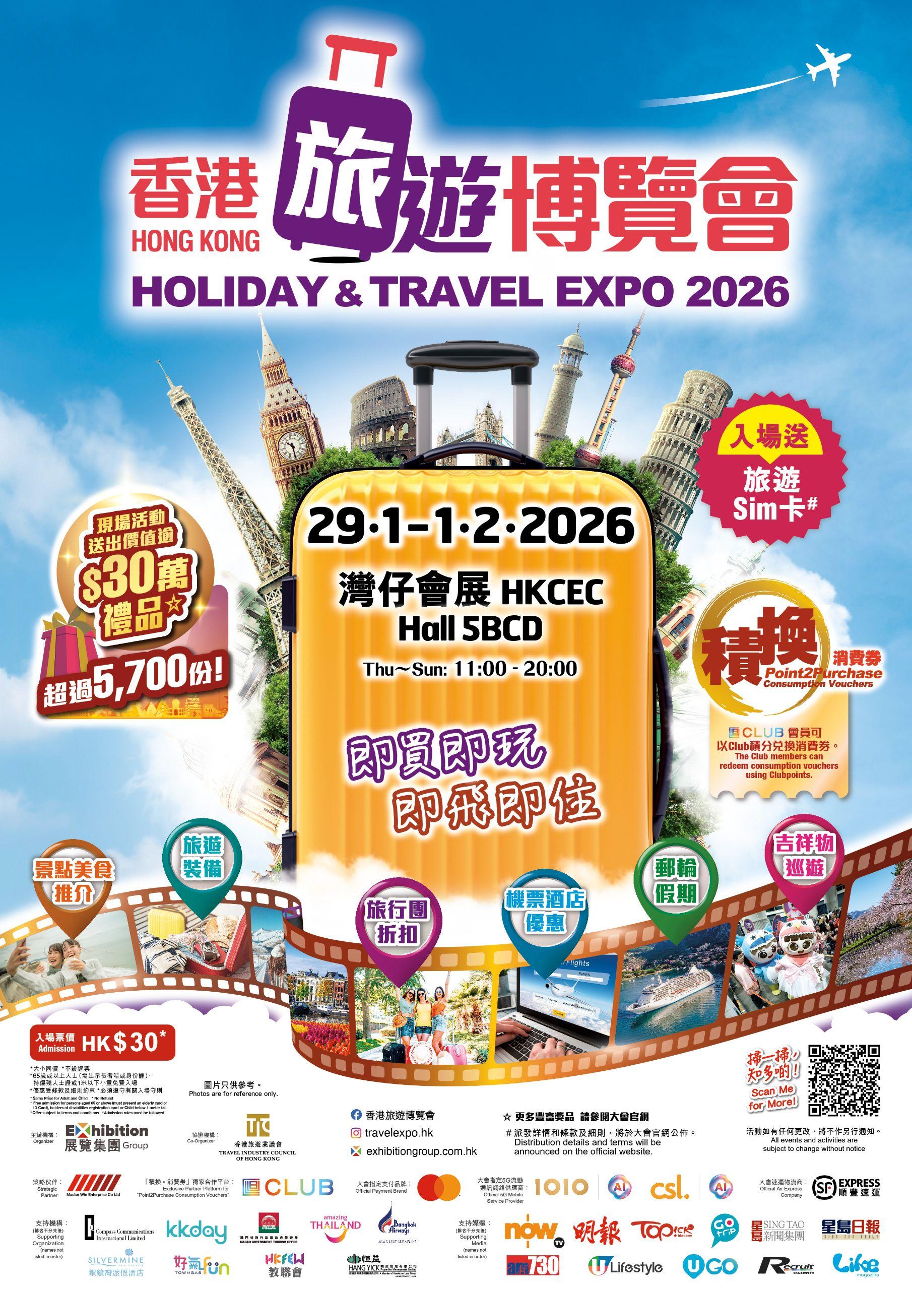 The Hong Kong Holiday & Travel Expo 2026 will be held Jan. 29 to Feb. 1 at the Hong Kong Convention and Exhibition Centre, inviting the public to explore travel possibilities through four days of exhibitions, seminars, and destination showcases. With 300+ booths, the expo brings together travel agencies, tourism bureaus, lifestyle brands, airlines, and accommodation providers to present up-to-date travel offers for 2026.