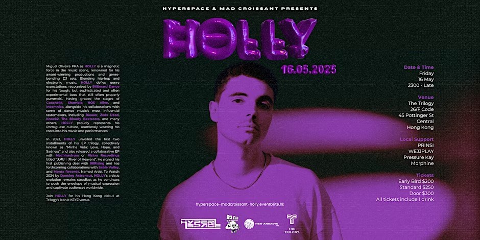 Experience the cutting edge of global bass music as Hyperspace Collective and Mad Croissant Present HOLLY on Friday, May 16, 2025, from 11 PM to 4 AM, at KEYZ, Trilogy. Making his Hong Kong debut, HOLLY (also known as Miguel Oliveira) brings his signature fusion of hip-hop, bass, and experimental electronic sounds to one of the city’s most iconic rooftop venues.