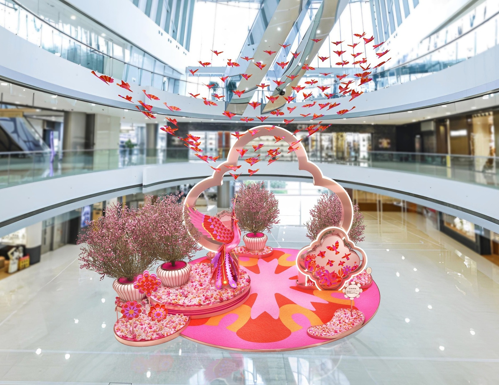 Guests can explore the immersive journey beginning at Spinning Petals, where vibrant flower-shaped pinwheels cascade in motion, continuing to Tribute for Abundance, the centerpiece of the installation. Here, the phoenix leads a vivid flock of birds dancing beneath the atrium dome, evoking grandeur and rebirth. At the Birds of Prosperity interactive station, visitors can awaken birds in flight and experience the dynamic interplay of color and movement, capturing the spirit of auspicious blessings.