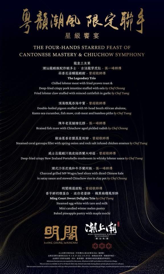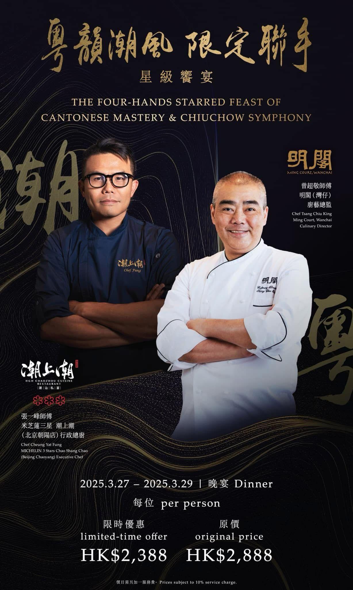 Experience an exquisite fusion of Cantonese and Chiuchow culinary mastery at the 4-Hands Starred Feast of Cantonese Mastery & Chiuchow Symphony, a three-night exclusive dining event from March 27-29, 2025, at Ming Court, Wanchai. Limited to just 30 guests per evening, this special collaboration between Cantonese master Chef Tsang and Chiuchow expert Chef Cheung showcases seasonal ingredients, intricate preparations, and time-honored traditions with a contemporary touch.