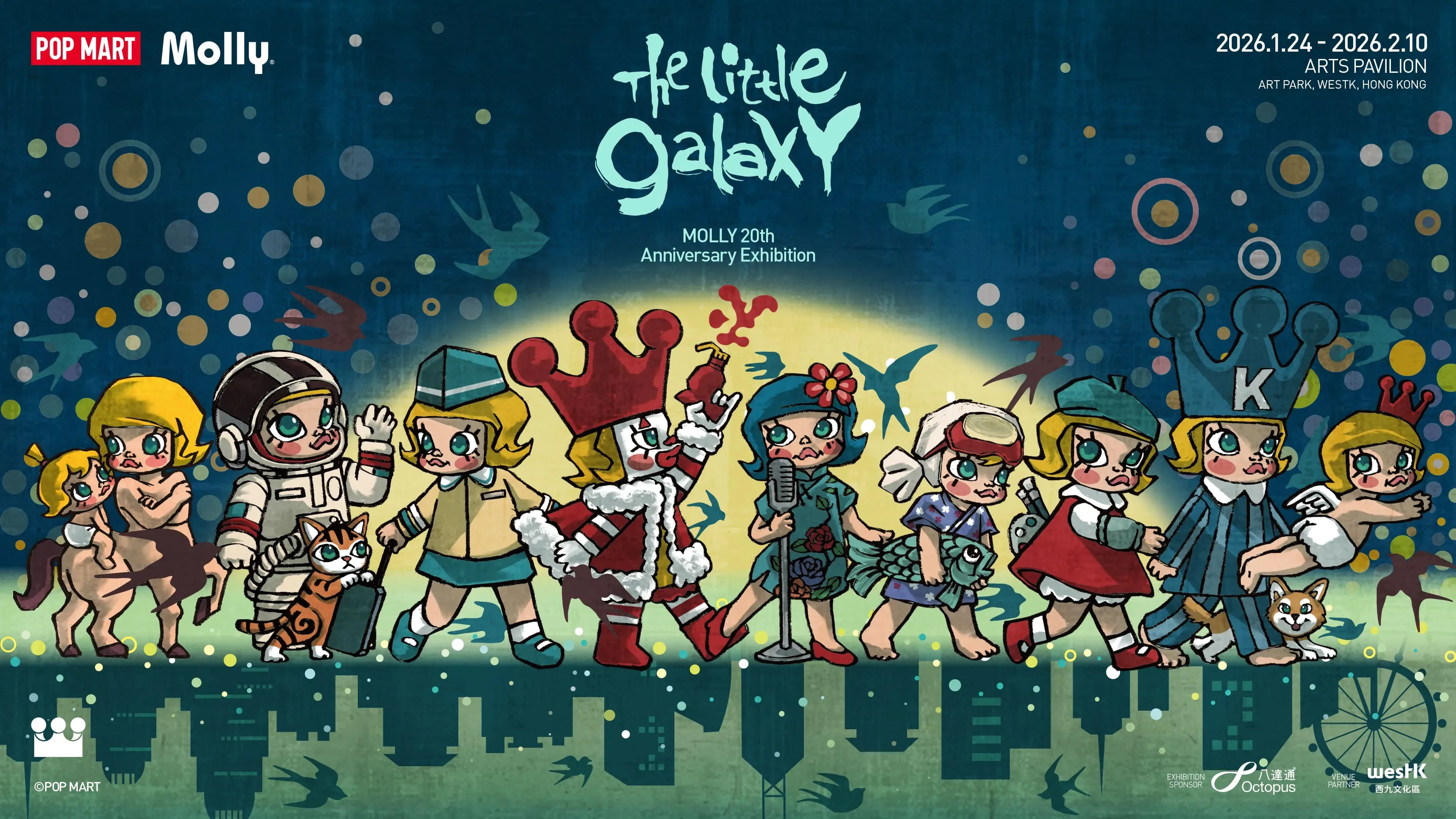 Discover the magic of MOLLY’s 20th Anniversary Exhibition, unfolding from Jan. 24 to Feb. 10, 2026, from 10 AM to 8 PM, at the Arts Pavilion, Art Park, West Kowloon Cultural District. Curated by POP MART and artist Kenny Wong, the exhibition invites the public to journey through MOLLY’s evolution from 2006 to 2026, tracing her imaginative universe, endearing personality, and artistic transformation over two decades.