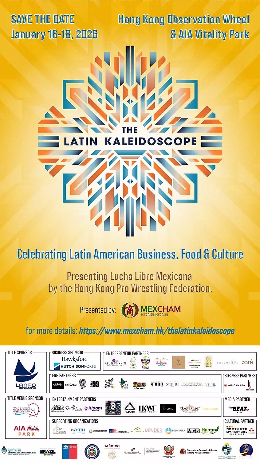 The Latin Kaleidoscope returns to HK Observation Wheel & AIA Vitality Park from January 16-18, 2026 for a three-day celebration of Latin American culture, community, and creativity. Hosted by the Mexican Chamber of Commerce in Hong Kong, this cultural showcase will feature an exciting blend of music, dance, food, language competitions, and visual arts.