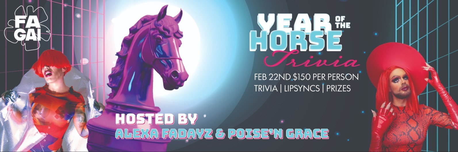 Gallop into the Lunar New Year with YEAR OF THE HORSE TRIVIA, a lively afternoon of glamour, laughter, and brain-teasing fun at Fa Gai. Taking place on Feb. 22, 2026, from 4 PM to 7 PM, this high-energy Drag Trivia experience transforms a classic pub quiz into a dazzling celebration filled with wit, charisma, and unforgettable performances.