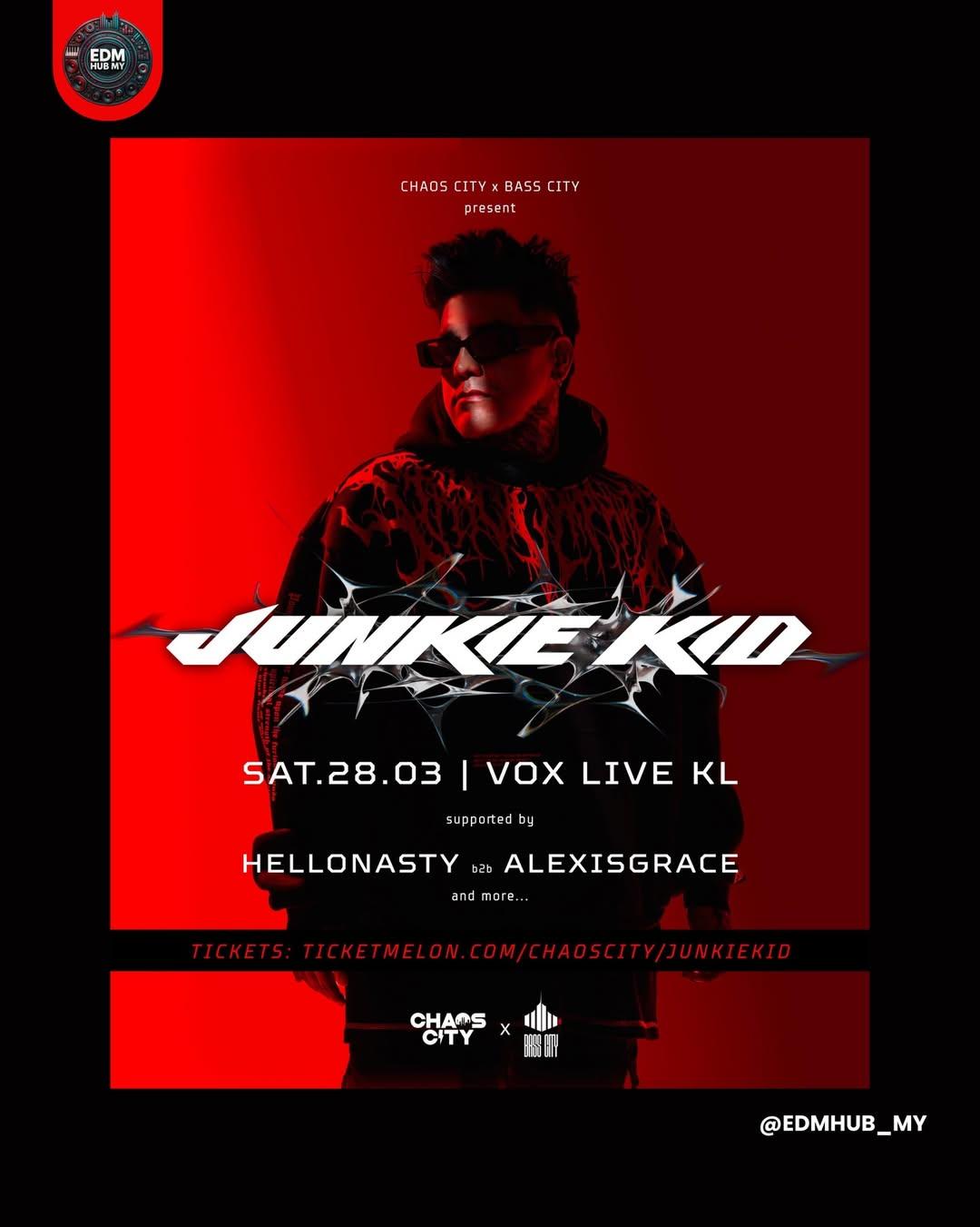 Rave enthusiasts are summoned to CHAOS CITY x BASS CITY PRESENT: JUNKIE KID, a high-octane bass event at Vox Live in Kuala Lumpur on March 28, 2026, kicking off at 10 PM. This collaboration unleashes the explosive energy of JUNKIE KID, known for pounding rhythms and crowd-hyping drops that dominate the electronic scene.