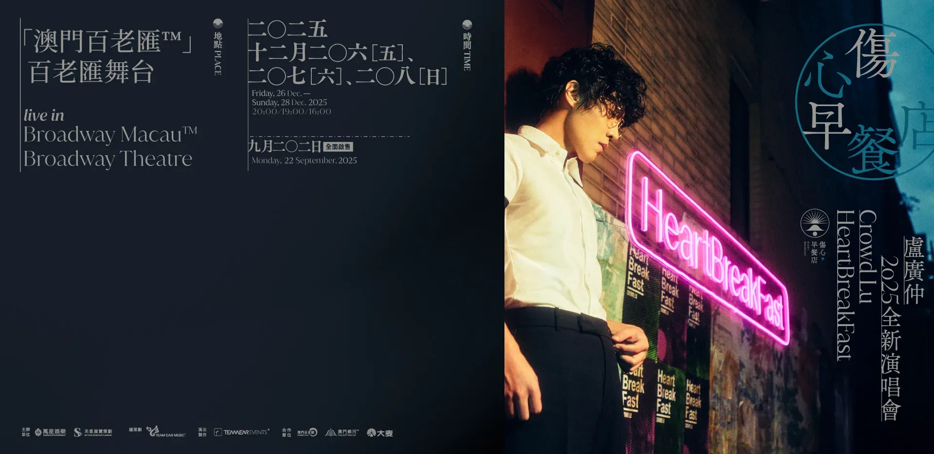 Join Taiwanese singer-songwriter Crowd Lu for his special "HeartBreakfast" concert series at Broadway Theatre at Broadway Macau across three days in Dec. 2025. Performances are scheduled for Dec. 26 at 8PM, Dec. 27 at 7PM, and Dec. 28 at 4PM, offering multiple opportunities to experience his uplifting music.