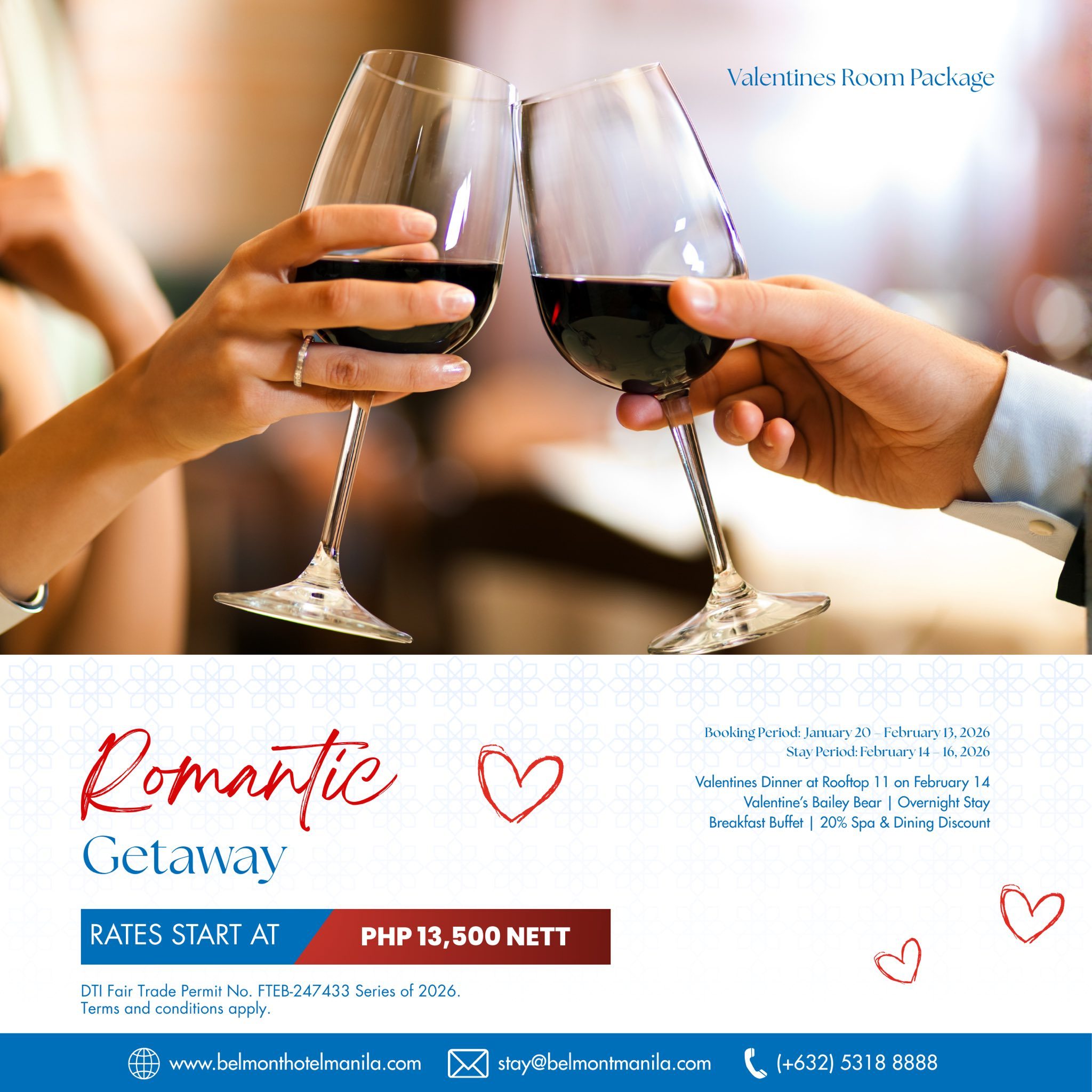 Packages are available for stays from Feb. 14–16, 2026. Booking period is until Feb. 13. Rates start at P6,900 nett for the staycation and P13,500 nett for the Romantic Getaway. Guests are encouraged to reserve early to secure their preferred dates and packages.