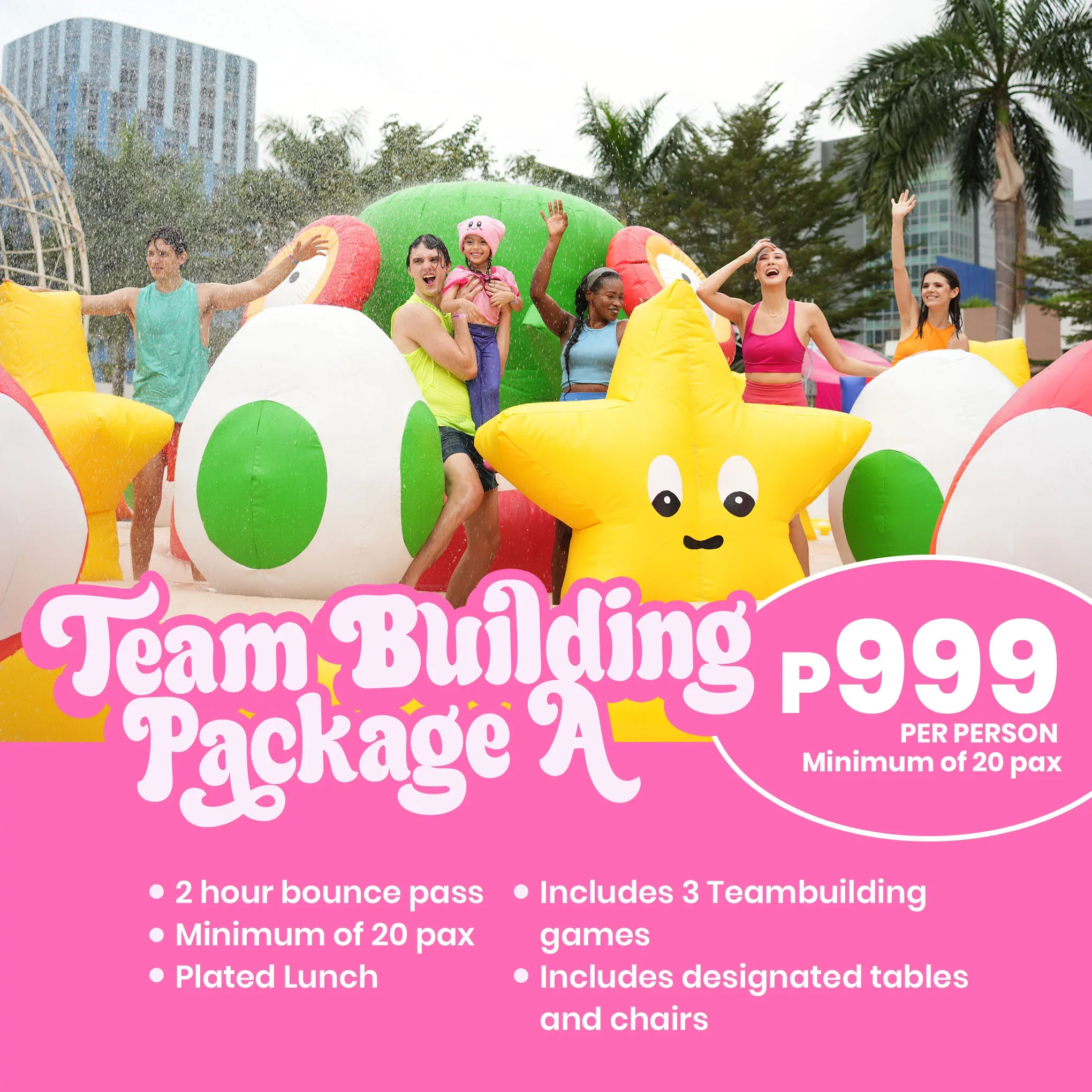 - Package A (P999 per person): 2-hour bounce pass, three team-building games, plated lunch, and designated tables and chairs.