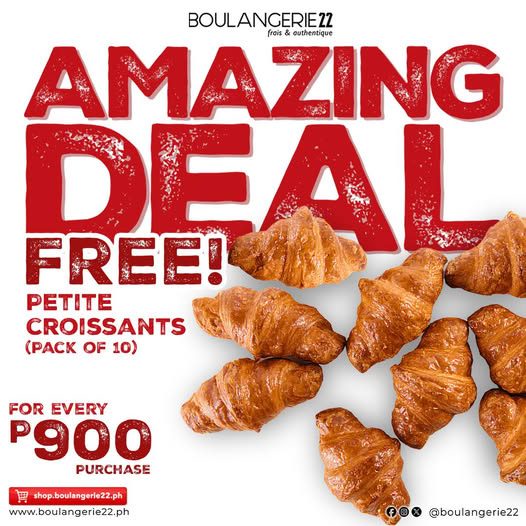 Indulge in the buttery goodness you love with Boulangerie22’s special promo. Every P900 spent earns you a free 10-piece pack of Petite Croissants—perfectly flaky and fresh from the oven.