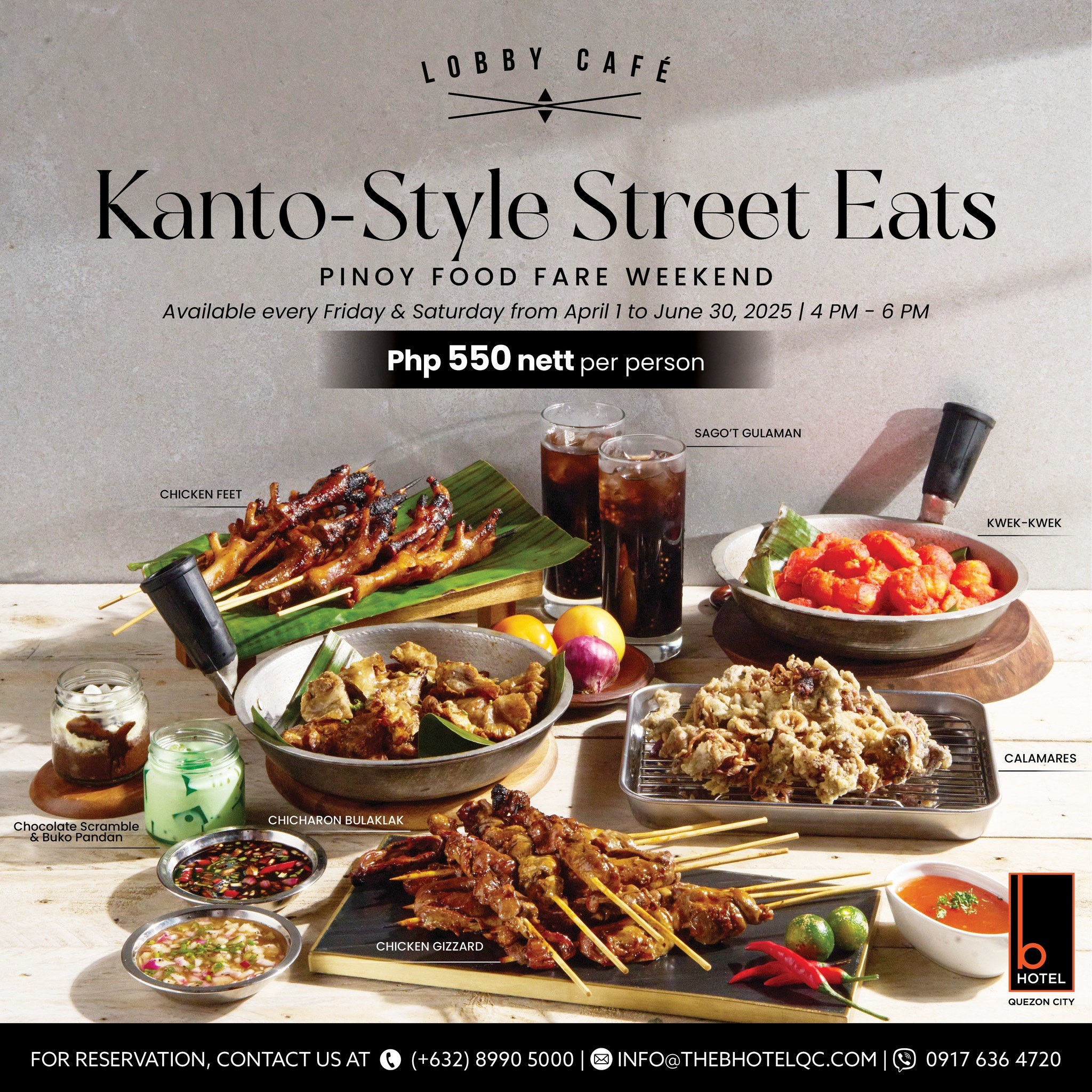 Experience the vibrant flavors of Filipino street food like never before at Kanto-Style Eat Street Eats in The B Hotel Quezon City. Running from April 1 to June 30, 2025, this exciting culinary event brings the best of local favorites to the hotel’s cozy dining space, served for just P550 per person. Catch it every Friday and Saturday from 4 PM to 6 PM, and dive into a wide selection of nostalgic food and snacks reimagined with The B Hotel’s signature flair.