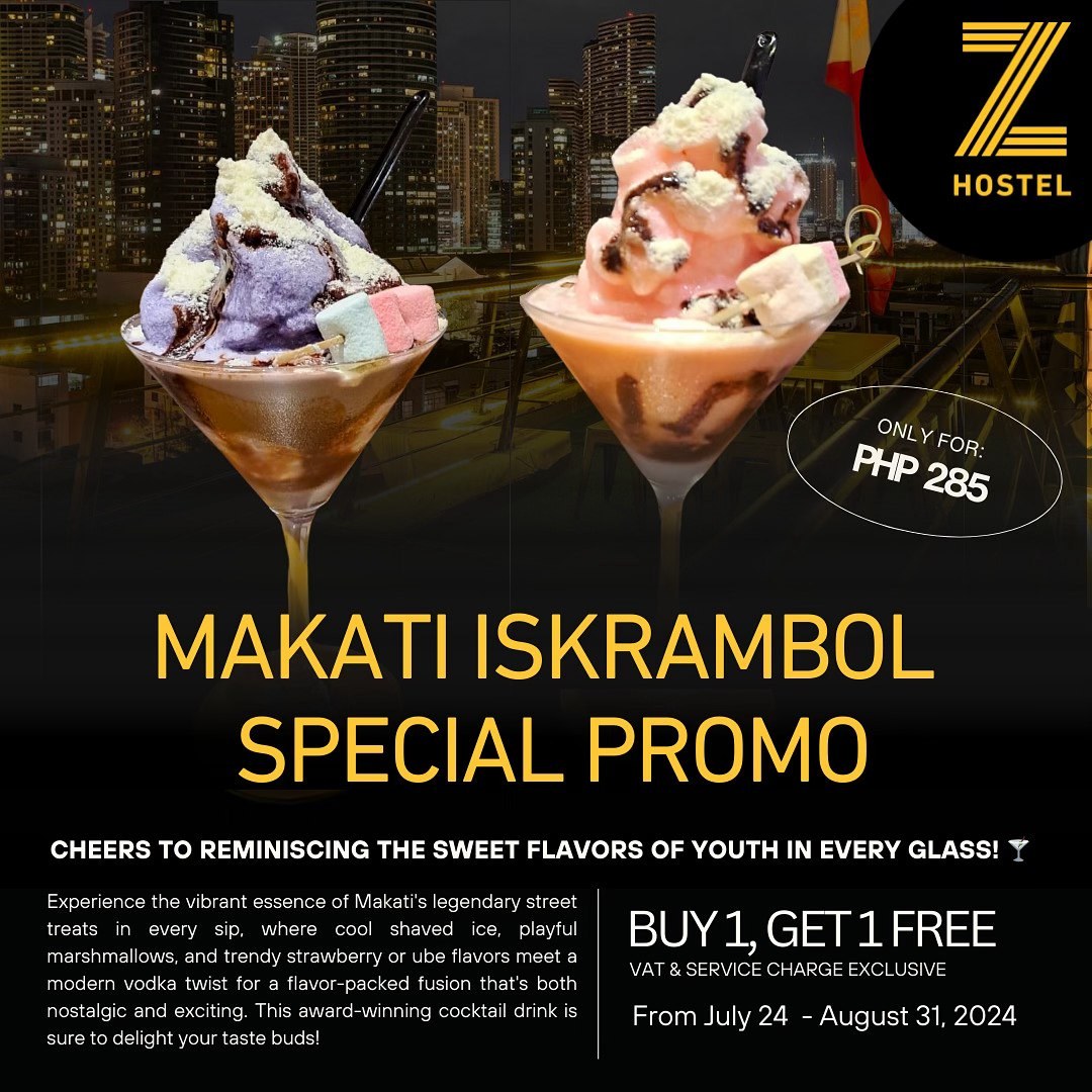 Experience the vibrant essence of Makati's legendary street treats with the Makati Iskrambol Special Promo at Z Hostel Roofdeck. Enjoy a buy 1, get 1 free offer on this award-winning cocktail for only P285 from July 24 to Aug. 31, 2024. This delightful drink combines cool shaved ice, playful marshmallows, and trendy strawberry or ube flavors with a modern vodka twist, creating a flavor-packed fusion that's both nostalgic and exciting.