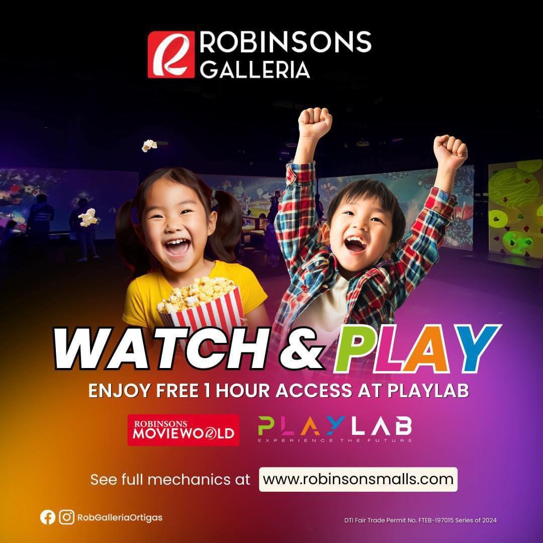 Take movie time to the next level with Robinsons Movieworld x PlayLab’s Watch & Play Promo! Get 1 hour of free access at PlayLab Galleria Ortigas when you watch a movie at Robinsons Movieworld. Simply present the promo voucher and two movie tickets at the PlayLab counter on Level 4. This offer is valid for movies rated G and PG, making it the perfect activity for families and young ones.