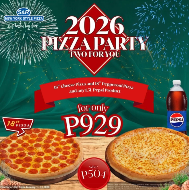 Kick off the new year with S&R New York Style Pizza’s January 2026 pizza promo. Choose your favorites from 18-inch Cheese, Pepperoni, or Garlic & Shrimp pizzas, paired with a 1.5L Pepsi or Coke, all for just P929–P979. It’s a simple, shareable feast for friends, family, or anyone craving big pizza flavors to start the year right.