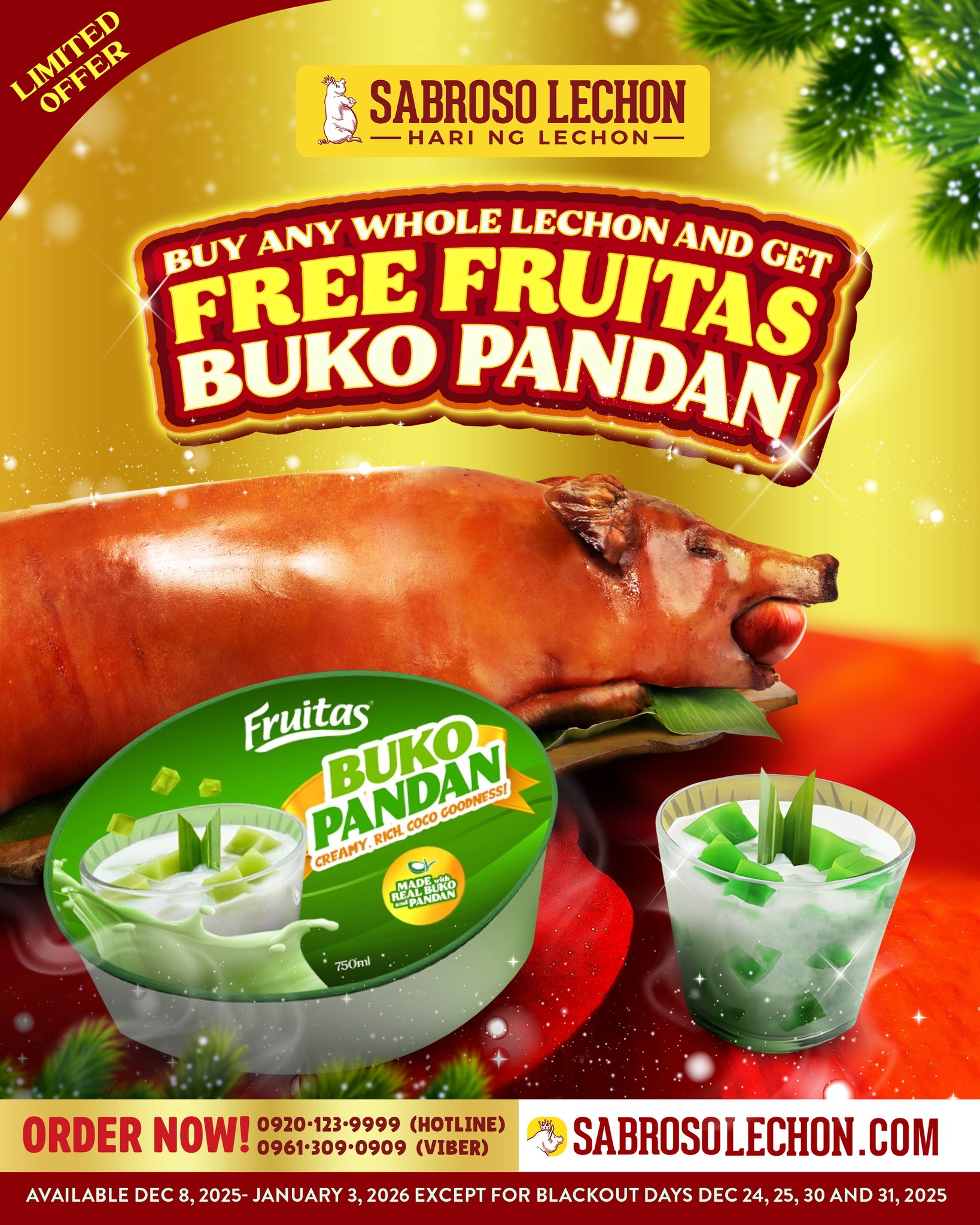 Planning a festive handaan this pasko? Sabroso Lechon is adding a sweet treat to your celebration with a limited-time holiday promo. From Dec. 8, 2025 to Jan. 3, 2026, customers who purchase a Whole lechon will receive a free Fruitas buko pandan (750 ml) to complete their spread.