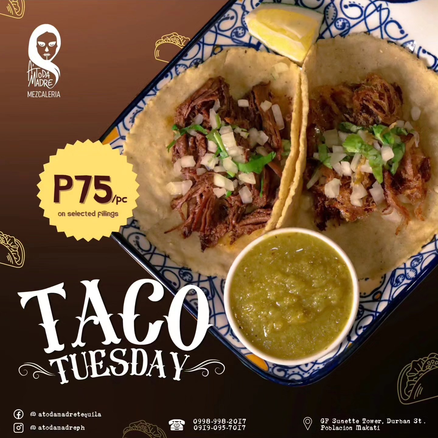 Get ready to satisfy your taco cravings at A'Toda Madre! Authentic Mexican street tacos with handmade corn tortillas are back for a limited time, every Tuesday in October. Indulge in the irresistible flavors of these culinary delights at an unbeatable price of P75 per taco.