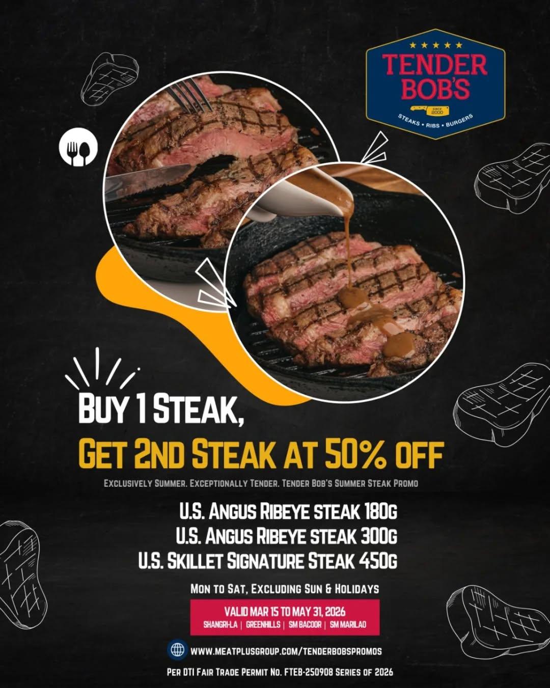 Tender Bob’s latest Steak Promo invites diners to enjoy selected U.S. steak cuts at a special value from March 15 to May 31, 2026. Available Monday to Saturday, excluding Sundays and holidays, the promotion is valid for dine‑in only at participating Tender Bob’s locations.