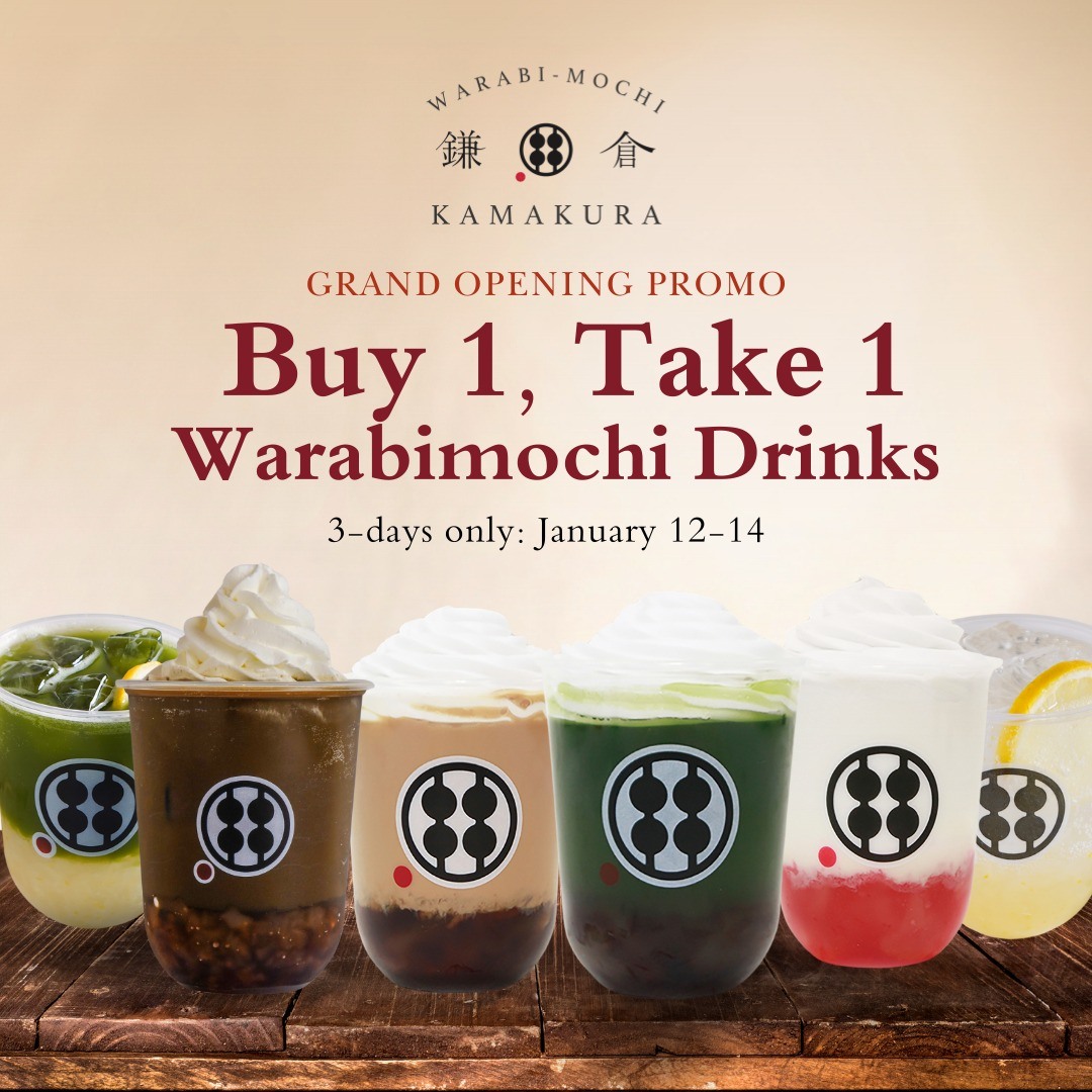 To celebrate, they’re offering a Buy 1, Take 1 promo on Warabimochi drinks from Jan. 12-14. Customers can enjoy an extra drink (choices: Coffee Milk or Lemonade) for free with every purchase. Promo is limited to 1 use per customer, per day during the three-day event.