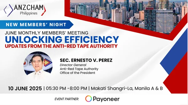 Join ANZCHAM Philippines for its June Monthly Members’ Meeting & New Members’ Night on June 10, 2025, from 5:30 PM to 8:00 PM at Makati Shangri-La, Manila A & B.