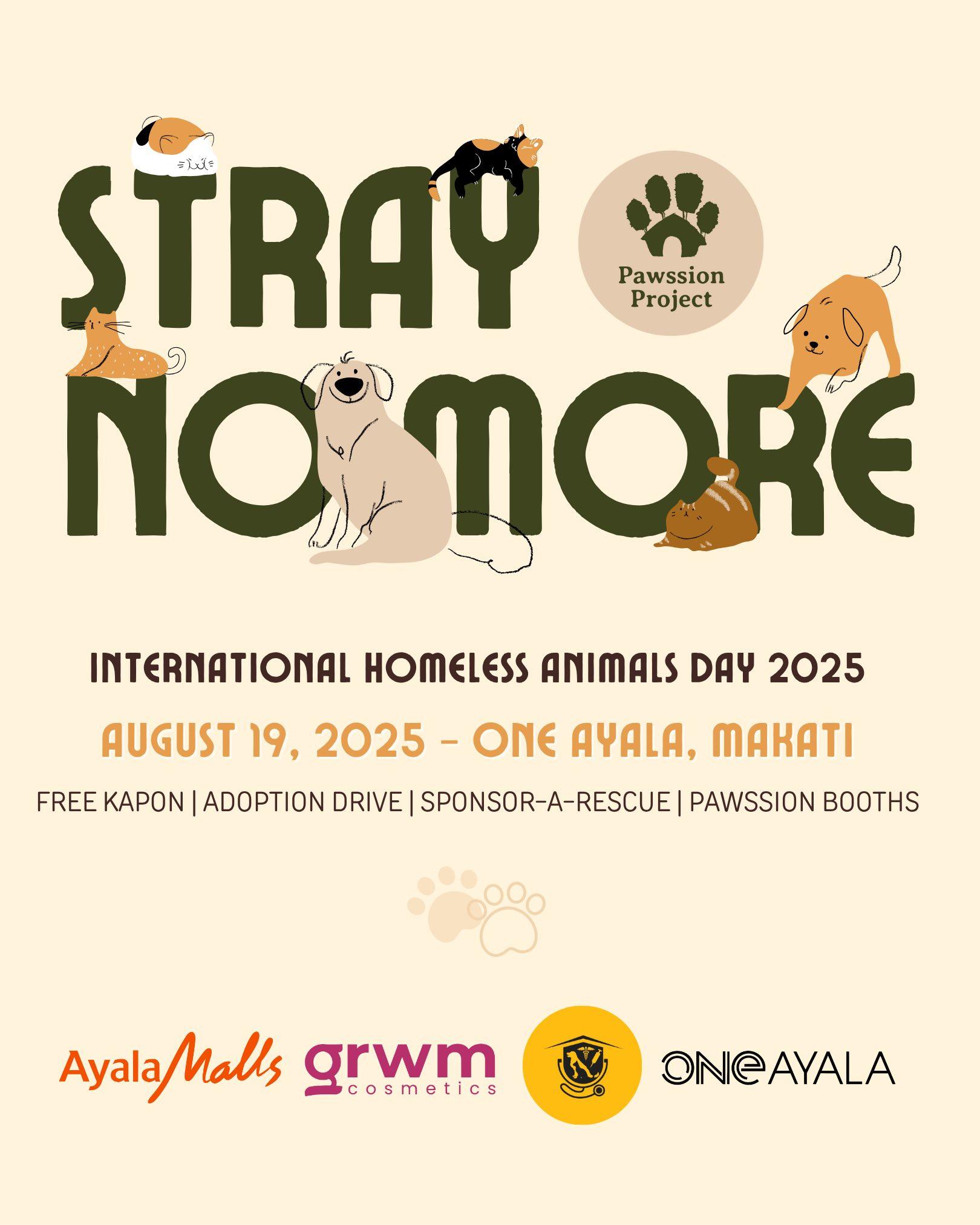 Join Stray No More by Pawssion Project at One Ayala, Makati on Aug. 19, 2025, — a heartfelt celebration of International Homeless Animal Day. This event shines a spotlight on homeless yet hopeful cats and dogs, giving them the chance to find loving homes.
