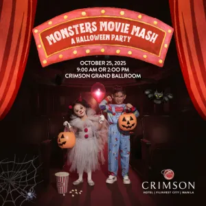 At Crimson Hotel Filinvest City, Manila's "Monsters Movie Mash," kids get the red-carpet treatment. This Halloween party is designed for children aged 2 and above, where monsters of all kinds come together for a day of interactive shows, games, a costume contest, and trick-or-treating.