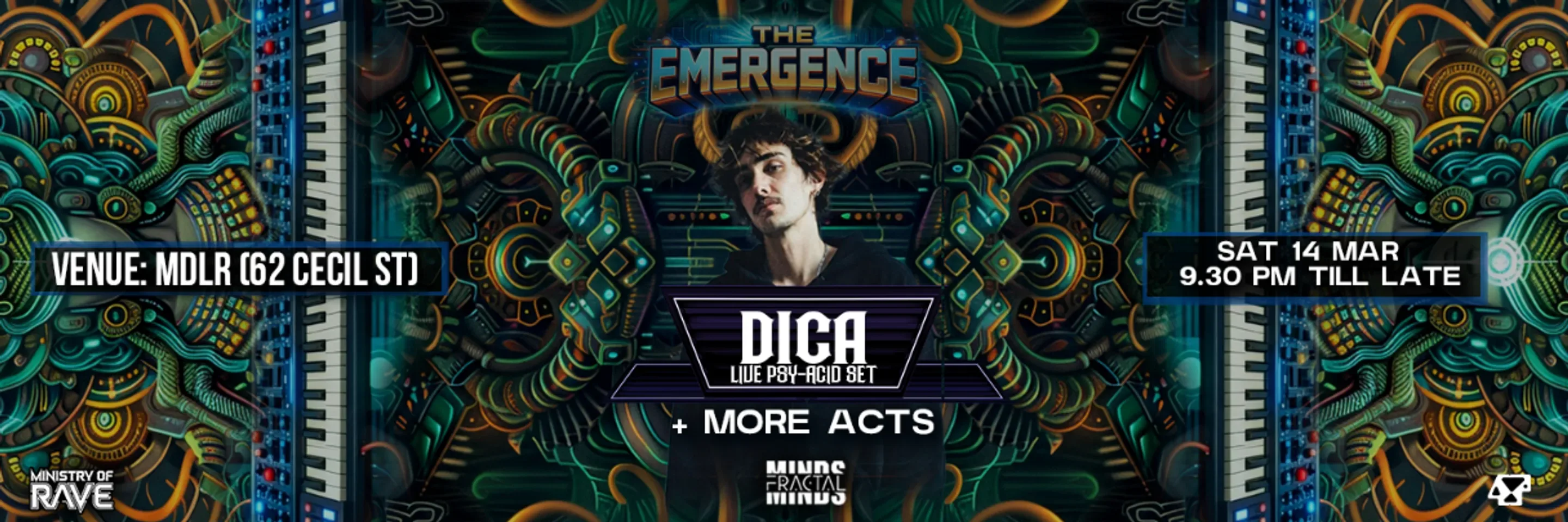Fractal Minds: The Emergence delivers a full-spectrum psytrance all-nighter at MDLR in Singapore on Saturday, 14 March 2026, from 9:30 PM – 3:15 AM. Presented by ΔIV, 4xFandMinistry of Rave, this event transforms Thugshop's MDLR into an immersive realm powered by a massive Martin Audio sound system and mind-bending visuals.