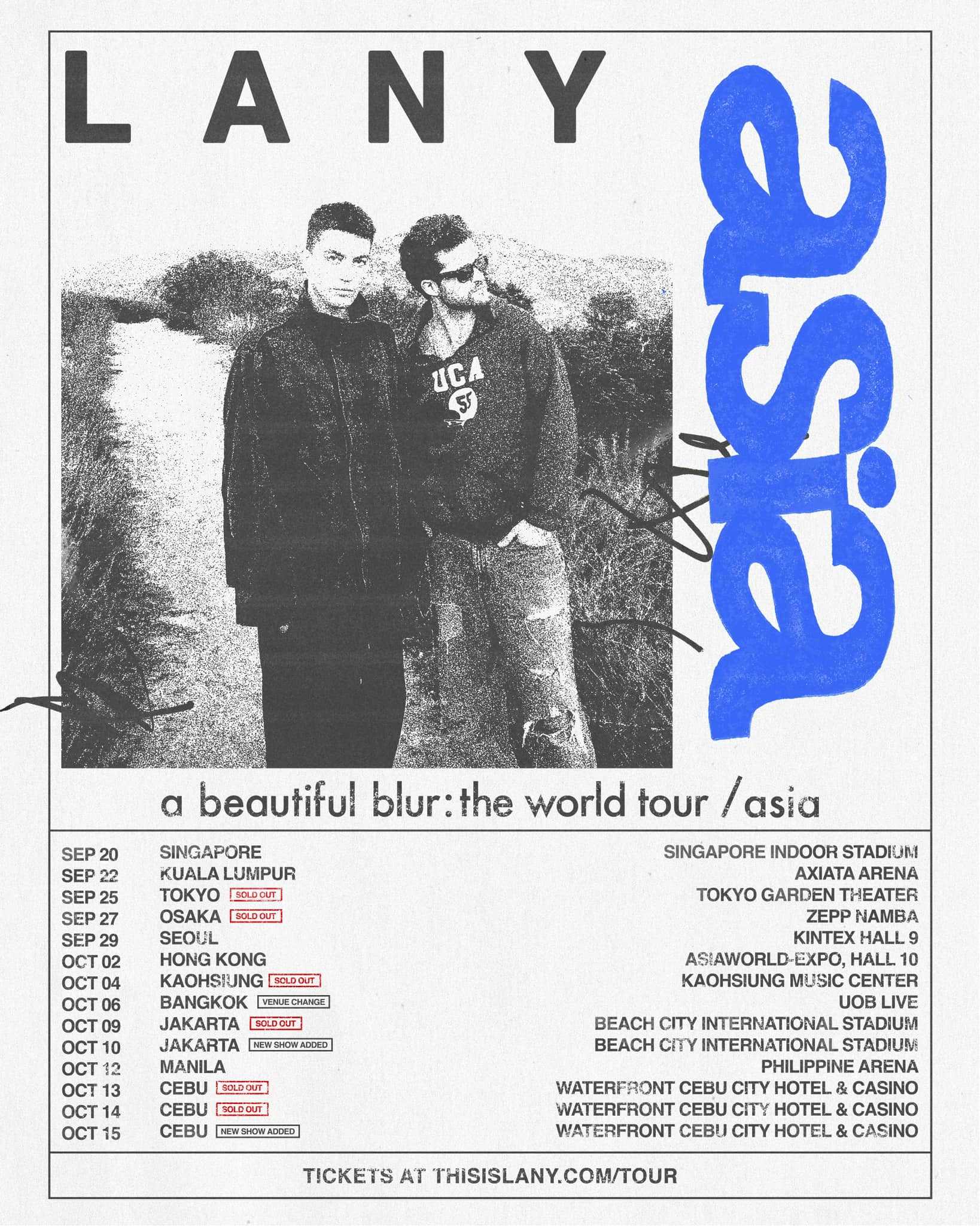 LANY, one of the most unpredictable and undeniable alternative rock bands of this era, brings their "a beautiful blur: the world tour" to Asia. Known for their hit anthems and enigmatic frontman Paul Jason Klein, LANY has tallied billions of streams, sold out legendary arenas, and earned widespread critical acclaim. With platinum-certified hits like "ILYSB" and gold singles such as "Malibu Nights," "Super Far," "I Quit Drinking" (with Kelsea Ballerini), and "Mean It" (with Lauv), their live shows captivate fans globally.